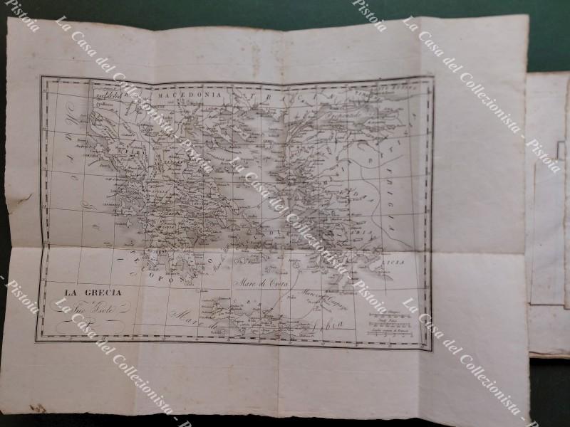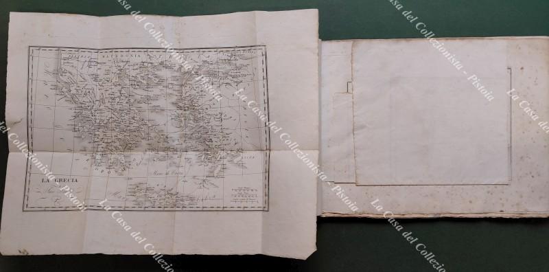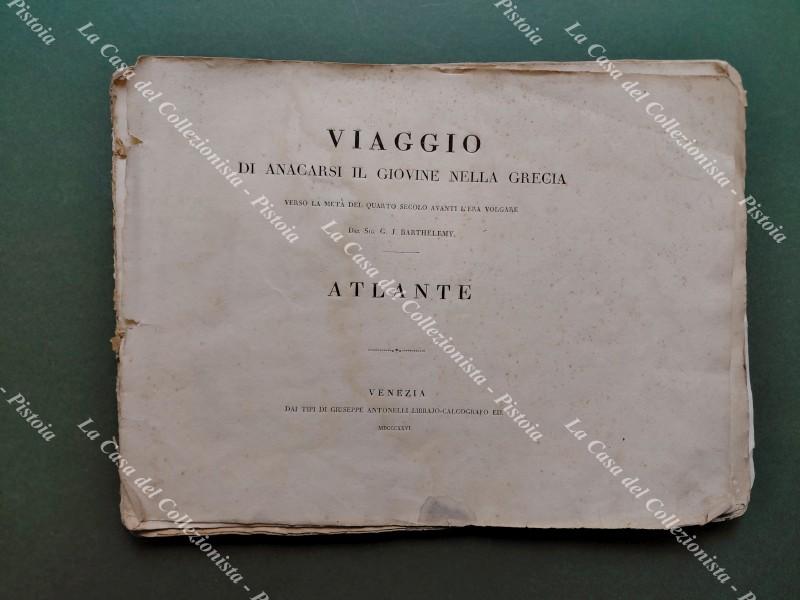 (Grecia) BARTHELEMY Jean Jacques. VIAGGIO DI ANACARSI IL GIOVINE NELLA GRECIA VERSO LA META' DEL QUARTO SECOLO AVANTI L'ERA VOLGARE. Venezia, Antonelli, 1828. ATLANTE. Brossura editoriale (manca il piatto anteriore), 10 pagine di testo, 33 tavole di carte e vedute numerate 1 - 32 (bis la numero 10). Esemplare privo del piatto anteriore della brossura, ingiallimenti, macchia al margine bianco inferiore, quasi slegato. (Rif.F7090)