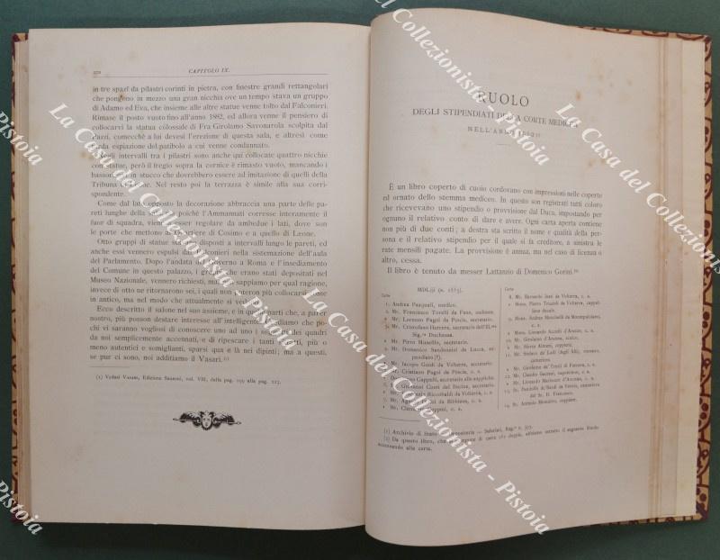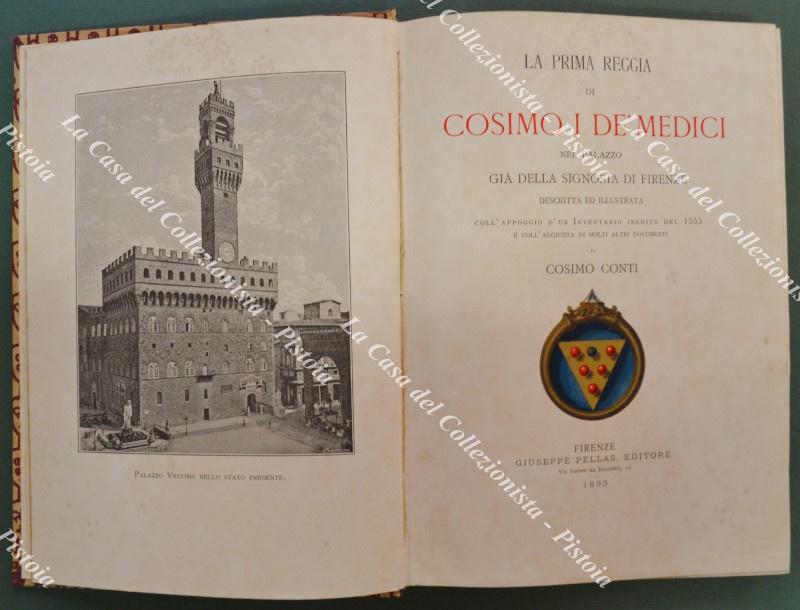 (Toscana, Firenze) CONTI COSIMO. LA PRIMA REGGIA DI COSIMO I DE' MEDICI NEL PALAZZO GIA' DELLA SIGNORIA DI FIRENZE. Descritta ed illustrata coll'appoggio d'un Inventario inedito del 1553 e coll'aggiunta di molti altri documenti da COSIMO CONTI. Firenze, Pellas, 1893. Cm 19,5x27,5, cartonatura novecentesca con tassello al dorso. Pp. IX + (3) + 290 + (2). Stemma mediceo in cromolitografia al frontespizio, antiporta figurata, una pianta a doppia pagina, tavole fuorin testo. Lievi ingiallimento, buon esemplare. (Rif.F7793-77)
