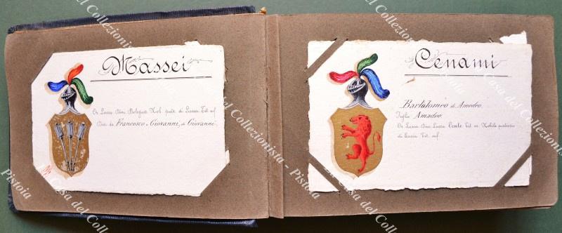 LUCCA - ARALDICA. Collezione di 53 cartoncini formato cartolina di cm 14x9. Su ciascuno uno stemma finemente realizzato a tempera e notizie biografiche. Quasi tutti firmati Provinciali (alcuni datati 1904). Perfetta conservazione. Famiglie presenti nella collezione: Andreozzi Motroni - Bernardini - Bottini - Brancoli – Busdraghi - Burlamacchi - Cantarini - Capitolo della Metropolitana - Cenami - Ceù - Cittadella – Castrucci - Comune di Lucca - Controni - De Navasquez - De Nobili - Di Grazia - Di Poggio - Fondora - Frediani - Gabbrielli - Gambarini - Garzoni - Ghivizzani - Giannardi - Giannini - Guinigi – Magrini - Lazzarini - Lucchesini - Mansi - Marchio - Massei - Massoni - Matteucci - Mazzarosa - Minutoli - Moscheni - Orsetti - Ottolini - Pacini - Parensi - Pollera - Poschi - Provenzali - Ricci - Rinaldi - Santini -