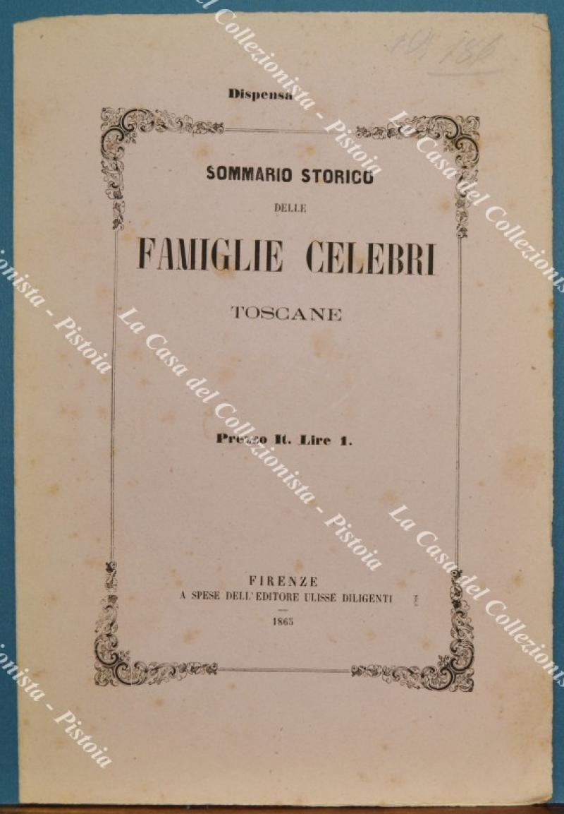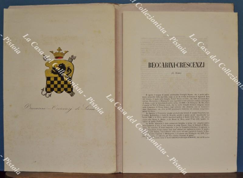 (Araldica - Toscana) Famiglia BECCARINI CRESCENZI di Siena. Fascicolo completo di cm 19,5x28,5: brossura editoriale contenente tavola colorata all'epoca a mano e 8 pagine di testo relative alla storia della famiglia. Il fascicolo è tratto dall'opera SOMMARIO STORICO DELLE FAMIGLIE CELEBRI TOSCANE di Tiribilli Giuliani - Luigi Passerini edita tra il 1862 ed il 1865 a Firenze da Alessandro Diligenti. Buona conservazione. (Rif.F7569)