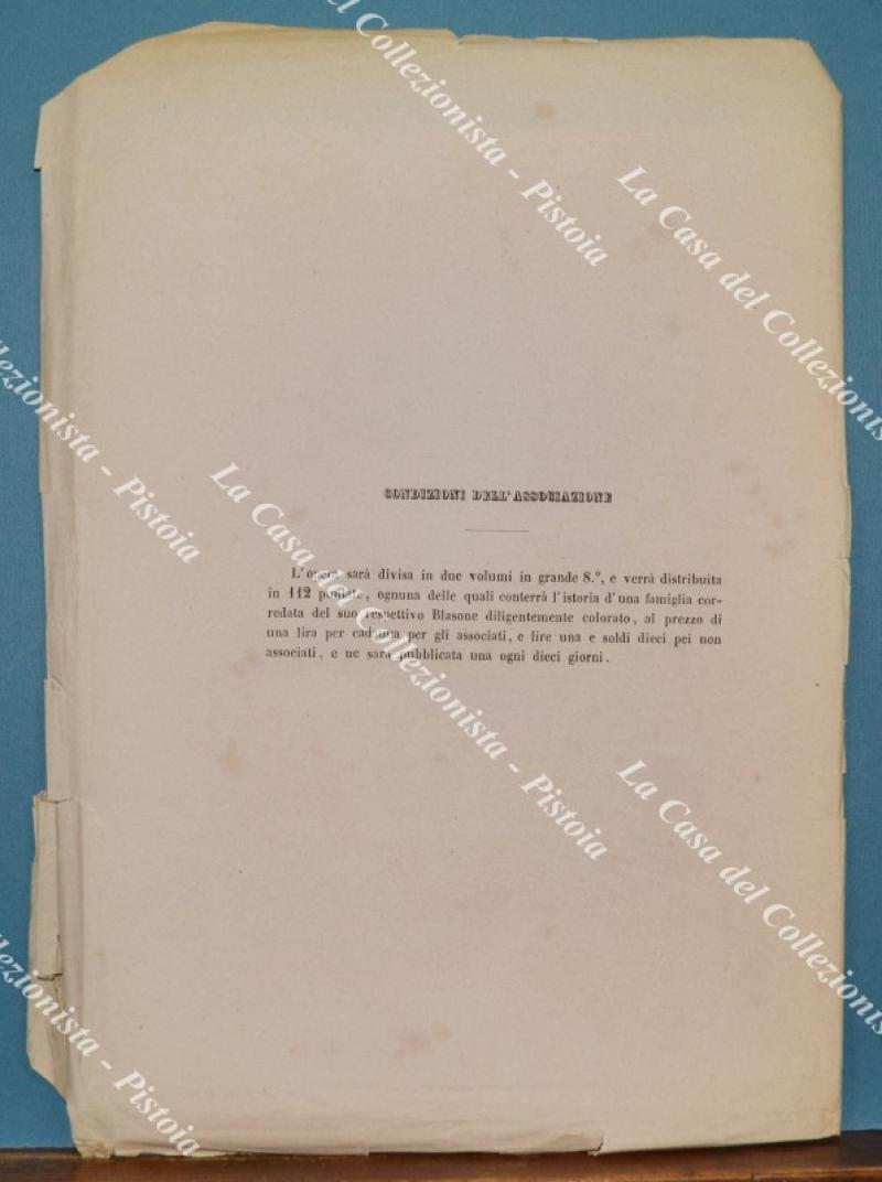 (Araldica - Toscana) Famiglia CONCINI d'AREZZO. Fascicolo completo di cm 19,5x28,5: brossura editoriale contenente tavola colorata all'epoca a mano e 3 pagine di testo relative alla storia della famiglia. Il fascicolo è tratto dall'opera SOMMARIO STORICO DELLE FAMIGLIE CELEBRI TOSCANE di Tiribilli Giuliani - Luigi Passerini edita tra il 1862 ed il 1865 a Firenze da Alessandro Diligenti. Buona conservazione, piccoli difetti laterali alla brossura editoriale. (Rif.F7572)