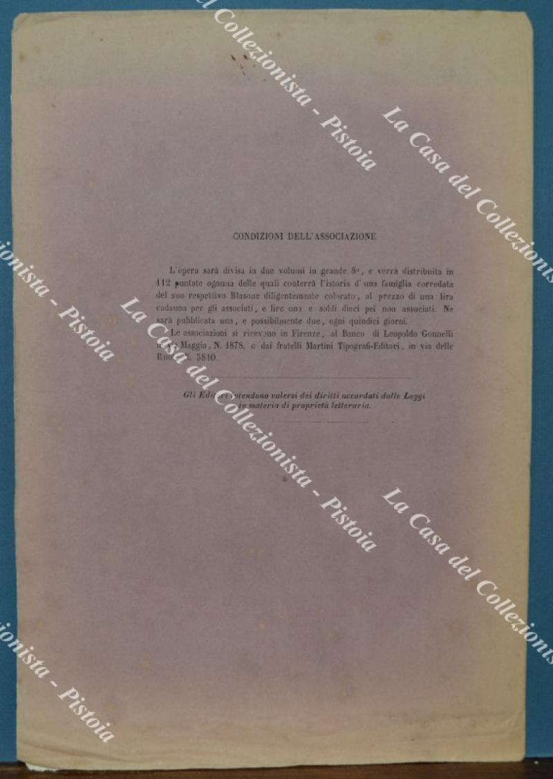 (Araldica - Toscana) Famiglia GAMBACORTI di PISA. Fascicolo completo di cm 19,5x28,5: brossura editoriale contenente tavola colorata all'epoca a mano e 6 pagine di testo relative alla storia della famiglia. Il fascicolo è tratto dall'opera SOMMARIO STORICO DELLE FAMIGLIE CELEBRI TOSCANE di Tiribilli Giuliani - Luigi Passerini edita tra il 1862 ed il 1865 a Firenze da Alessandro Diligenti. Buona conservazione. (Rif.F7580)