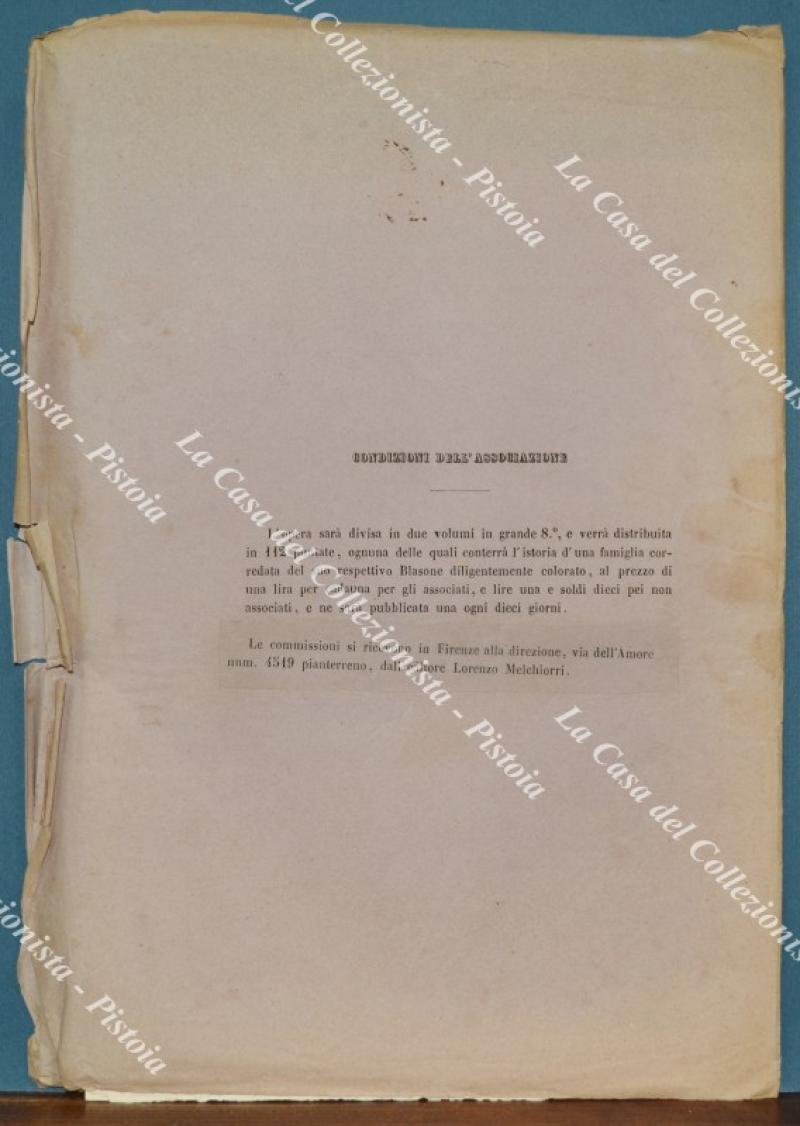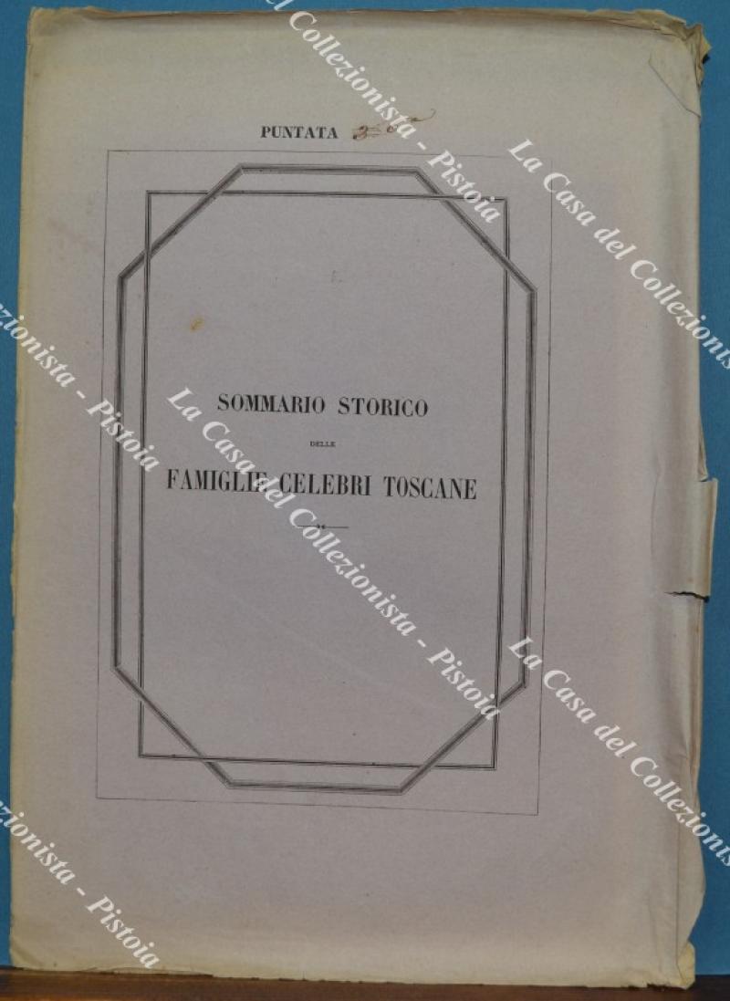 (Araldica - Toscana) Famiglia MARCHESI DEL MONTE S. MARIA (Firenze). Fascicolo completo di cm 19,5x28,5: brossura editoriale contenente tavola colorata all'epoca a mano e 6 pagine di testo relative alla storia della famiglia. Il fascicolo è tratto dall'opera SOMMARIO STORICO DELLE FAMIGLIE CELEBRI TOSCANE di Tiribilli Giuliani - Luigi Passerini edita tra il 1862 ed il 1865 a Firenze da Alessandro Diligenti. Buona conservazione, piccoli difetti laterali alla brossura editoriale. (Rif.F7576)