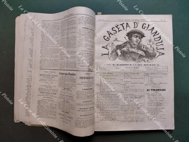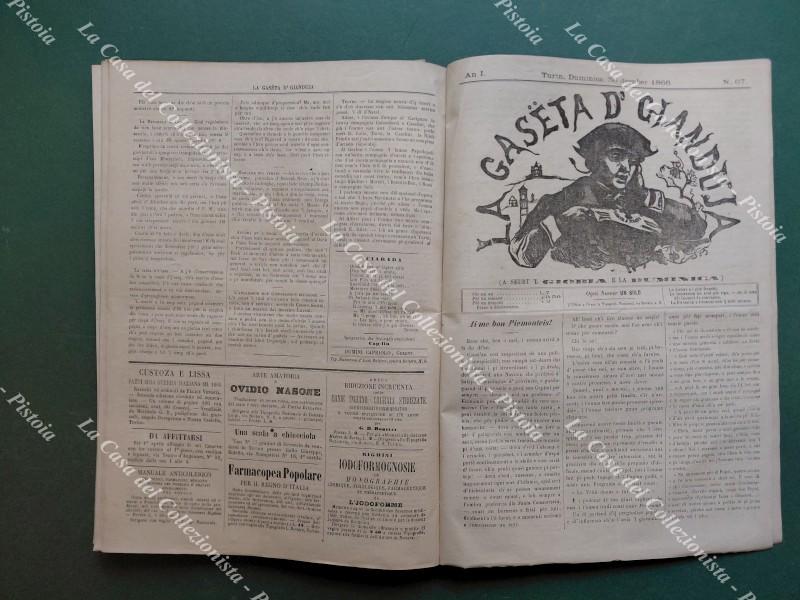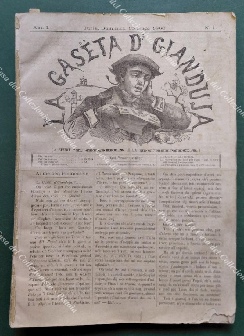 (Periodico '800, Piemonte) LA GASETA D' GIANDUJA. Periodico satirico piemontese. Usciva a Torino il giovedì e la domenica; ogni numero pp. 4 di cm 24x34. Pubblicato tra il 1866 ed il 1868 si ispirava alla popolare maschera del Carnevale piemontese, Gianduia, simbolo del contadino arguto e generoso, e dava commenti sulla società e la politica dell'epoca. Disponiamo dell'Anno I (1866) dal n. 1 del 13 maggio al n. 67 del 30 dicembre 1866. Mancano 6 numeri (16 - 17 - 18 - 19 - 29 - 33). Conservazione in generale buona eccetto rosicchiature all'angolo inferiore delle pagine dei primi due numeri. Molto raro. (Rif.F7091)