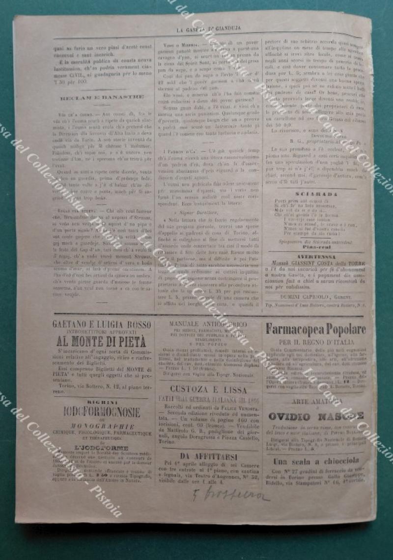 LA GASETA D' GIANDUJA. Periodico satirico piemontese pubblicato tra il 1866 ed il 1868.