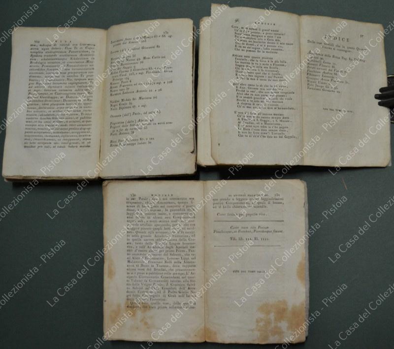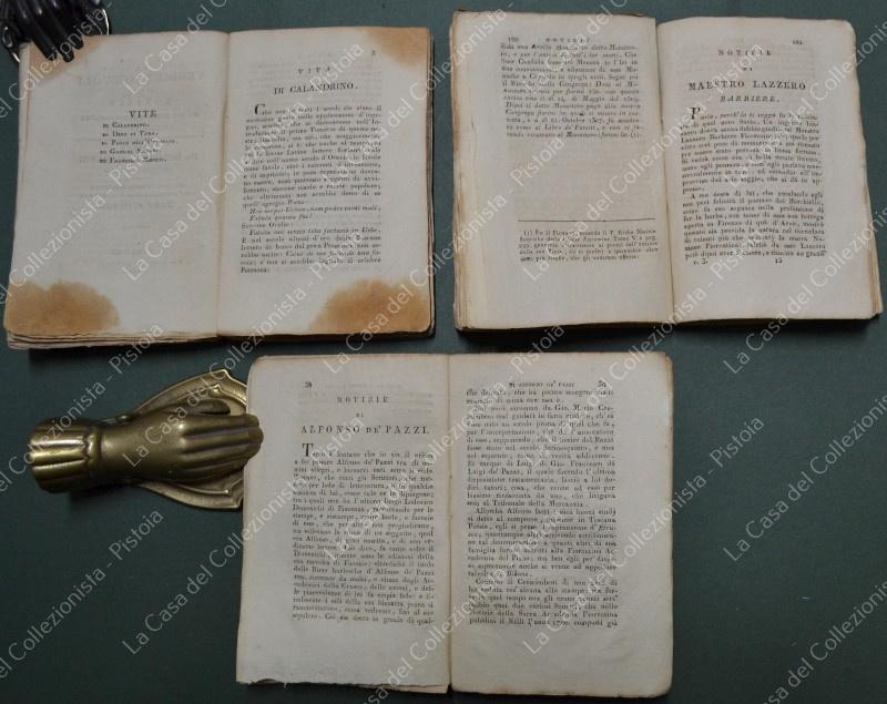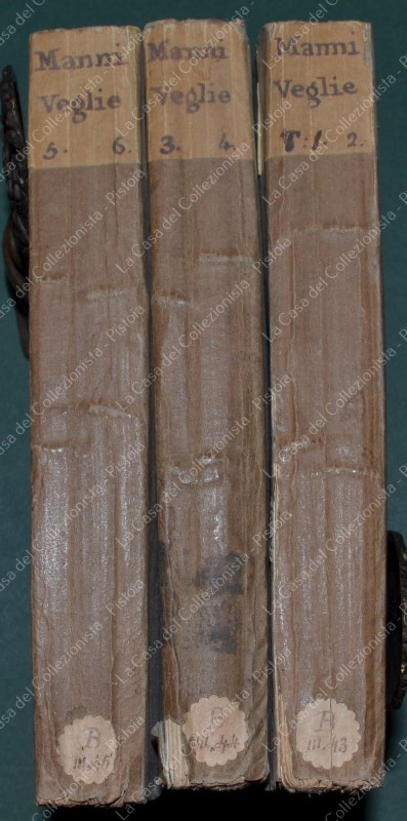 (Toscana - biografie). MANNI DOMENICO MARIA. LE VEGLIE PIACIEVOLI OVVERO NOTIZIE DE PIU' BIZZARRI E GIOCONDI UOMINI TOSCANI LE QUALI POSSONO SERVIRE DI UTILE TRATTENIMENTO. Seconda edizione fiorentina. Firenze, Gaspero Ricci, 1815 - 1816. Cm 11x17,3, brossure mute coeve. Disponiamo di 6 tomi su 8 (mancano il 7° e 8°) rilegati in 3 volumi: Pagine 136 + pagine 132 + pagine 144 + pagine 97 + pagine 138 + pagine 131 + (1). Conservazione buona eccetto deboli ingiallimenti, esemplare non rifatto. (Rif.F6755)