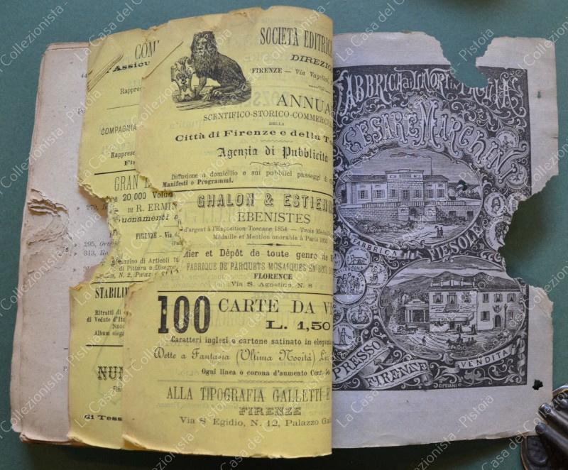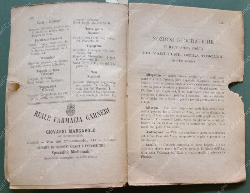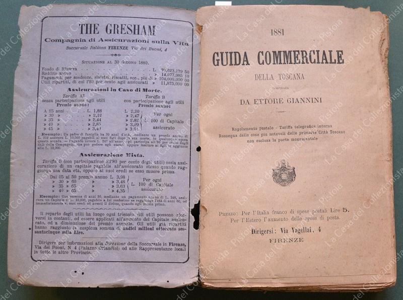 TOSCANA anno 1881. Guida Storico - Commerciale della Toscana. Compilata da Ettore Giannini. Anno 1881. Formato cm 12,5x19, brossura editoriale tipografica. Pagine 446 + alcune pubblicitarie. La prima parte è dedicata a Firenze, la seconda al resto della Toscana. Per ogni località, in ordine alfabetico, sono indicate varie attività artigianali e commerciali. Sono presenti vistose rosicchiature che interessano per lo più il margine bianco laterale. Rara. (Rif.F6786)
