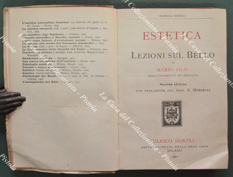 (Manuali Hoepli) PILO MARIO. ESTETICA. Lezioni sul bello. Seconda edizione. Milano, Hoepli, 1921. In 16° (cm 10,5x15), brossura editoriale, pp. XLVII + 255. Usure alla copertina. (Rif.F7796-77)