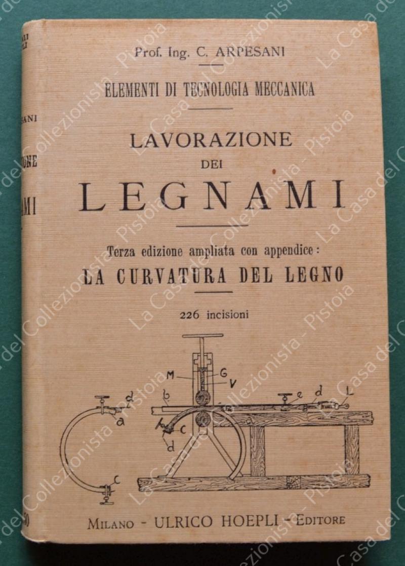 Manuale Hoepli. ARPESANI C.. LAVORAZIONE DEI LEGNAMI. Terza edizione rinnovata ed ampliata con 226 incisioni nel testo. Milano, Hoepli, 1917. In 16°, tela editoriale illustrata, pagine XI + 242. Buona conservazione. (Rif.F8053)