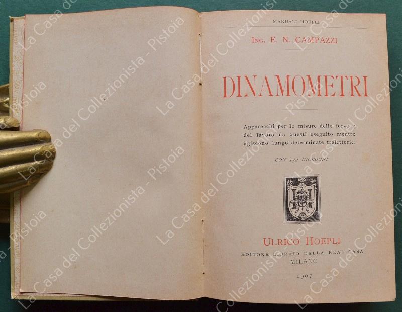 Manuale Hoepli. CAMPAZZI E. N.. DINAMOMETRI. Apparecchi per le misure delle forze e del lavoro da questi eseguito mentre agiscono lungo determine traiettorie. Mialno, Hoepli, 1907. In 16°, tela editoriale illustrata, pagine XX + 273 con 132 incisioni nel testo. Ottima conservazione. (Rif.F8048)
