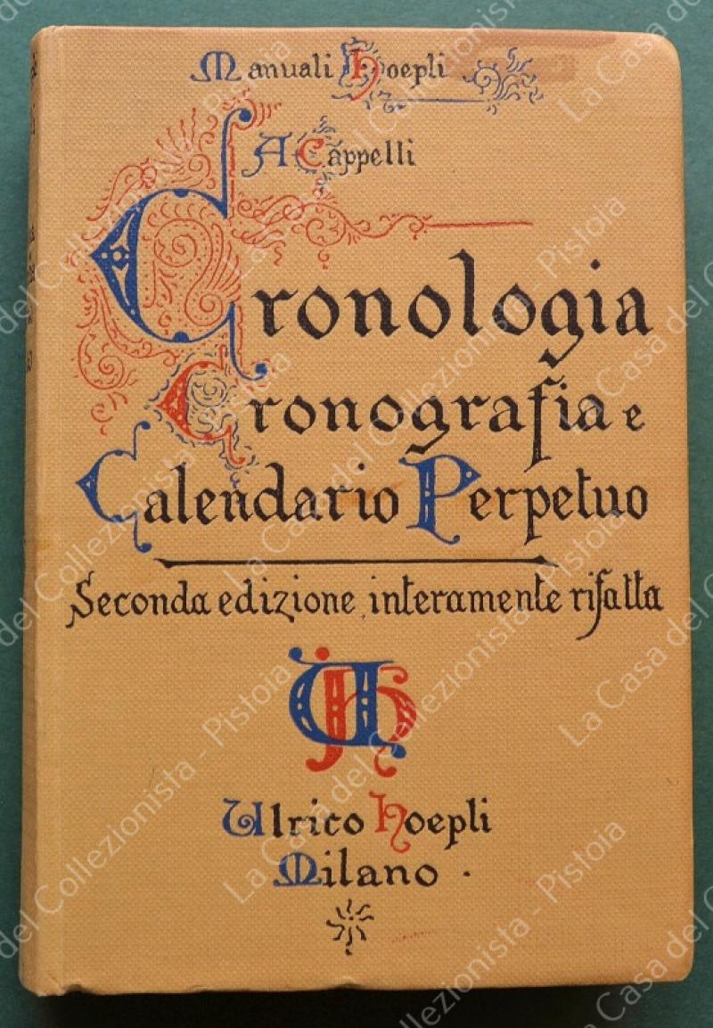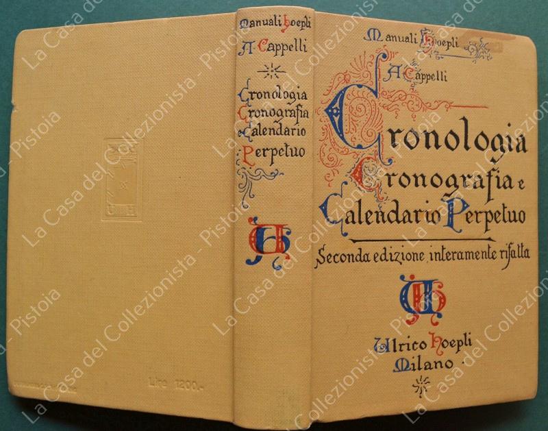 Manuale Hoepli. CAPPELLI A.. CRONOLOGIA, CRONOGRAFIA E CALENDARIO PERPETUO. Dal principio dell'Era Cristiana ai giorni nostri. Tavole cronologico - sincrone e quadri sinottici per verificare le date storiche. Seconda edizione interamente rifatta ed ampliata. Milano, Hoepli, 1930. In 16°, tela editoriale illustrata, pagine XI + 566. Buona conservazione. (Rif.F8049)