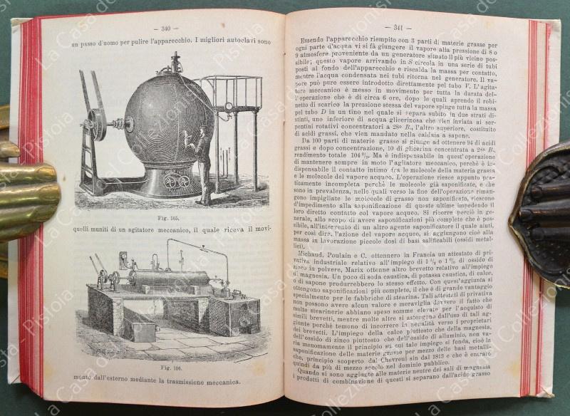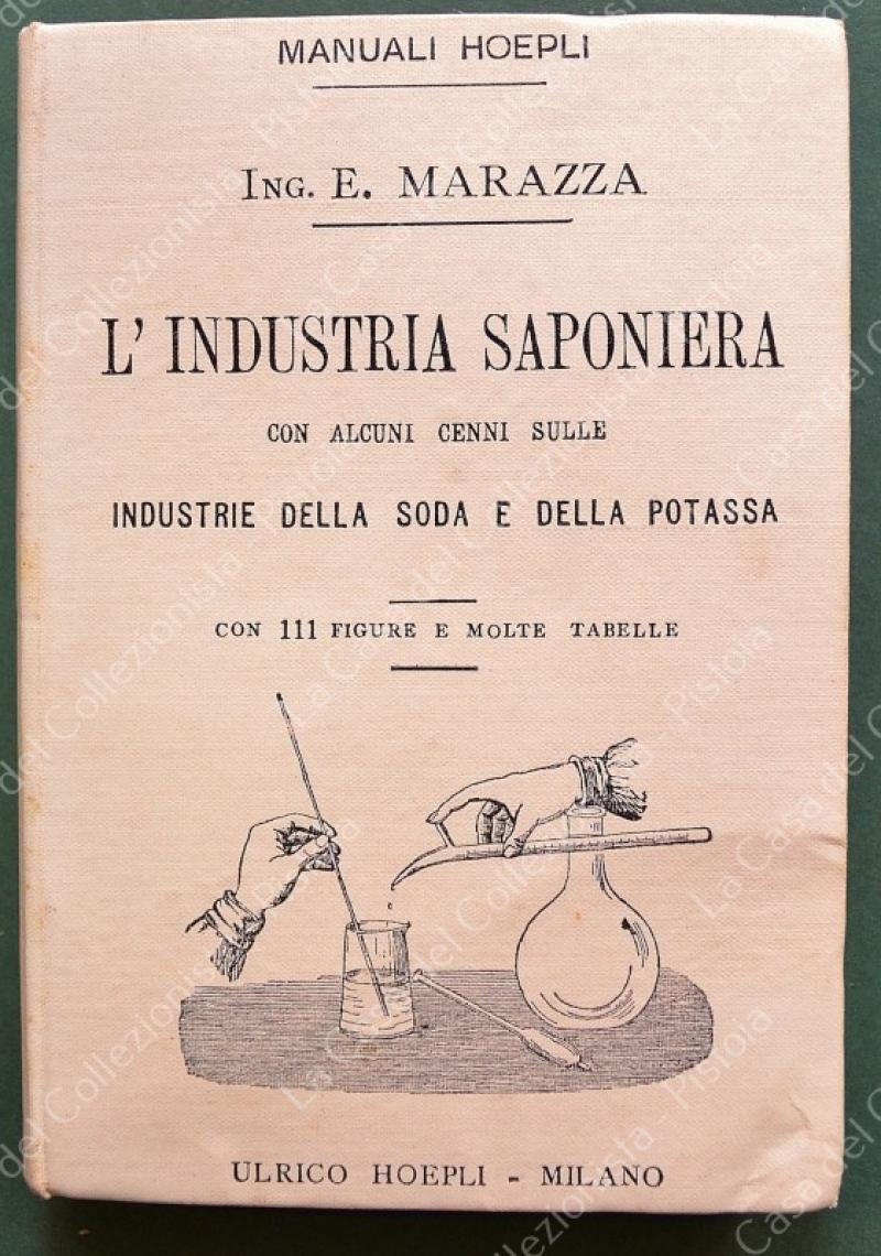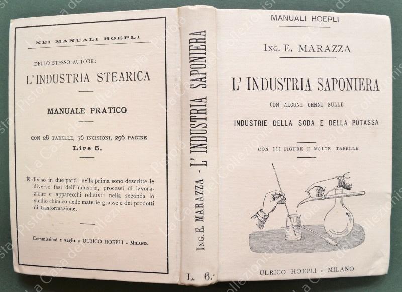 Manuale Hoepli. MARAZZA ETTORE. L'INDUSTRIA SAPONIERA. Con alcuni cenni sulle industrie della soda e della potassa. Milano, Hoepli,1896. Prima edizione. In 16°, tela editoriale illustrata, pagine VIII + 410 con 111 figure e molte tabelle. Ottima conservazione.