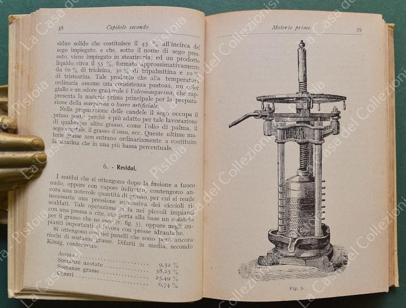 Manuale Hoepli. SCANSETTI VITTORIO. L'INDUSTRIA DELLE CANDELE. Estrazione e purificazione della glicerina. Milano, Hoepli, 1917. In 16°. tela editoriale illustrata, pagine XX + 401 con 98 incisioni nel testo. Ottima conservazione. (Rif.F8050)