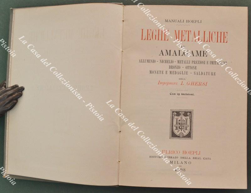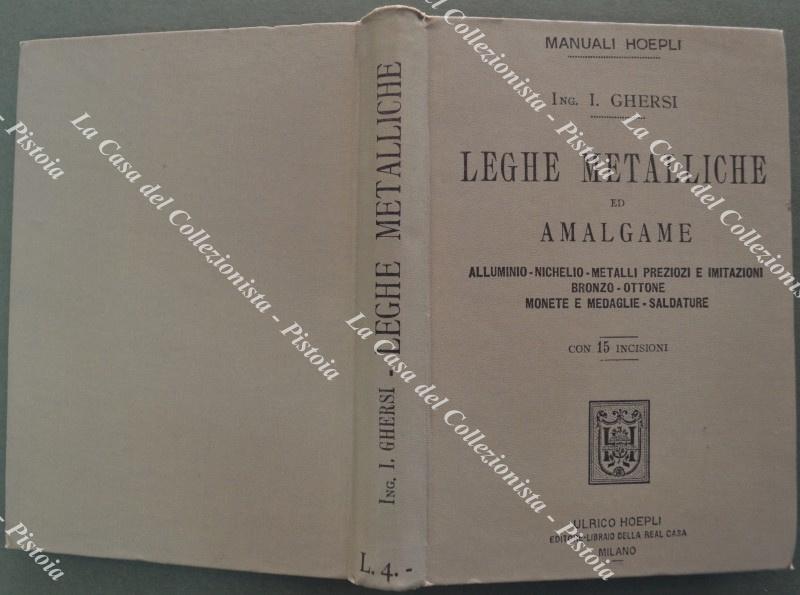 (Manuali Hoepli) GHERSI I.. LEGHE METALLICHE ED AMALGAME. Alluminio - Nichelio - Metalli preziosi e imitazioni - Bronzo - Ottone - Monete e medaglie - Saldature. Milano, Hoepli, 1898 (prima edizione). In 16° (cm 11x15.5), tela editoriale, pp. XII + 431. Ottima conservazione. (Rif.F7881)