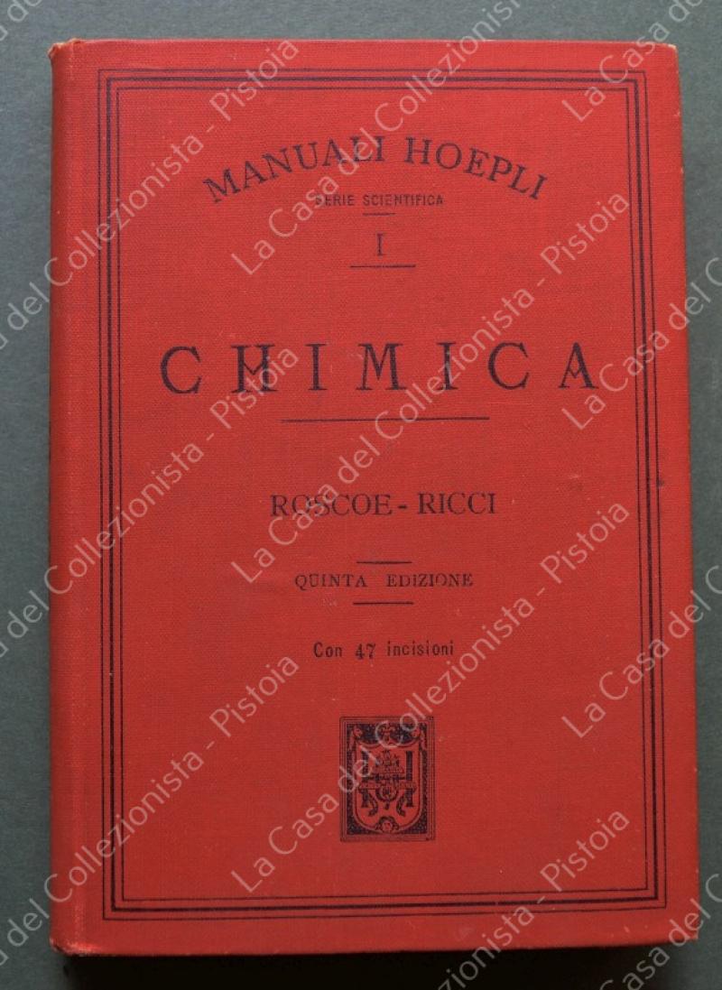 Manuali Hoepli. Roscoe H. E. - Ricci E.. PRIME NOZIONI DI CHIMICA. Quinta edizione italiana rifatta del dr. Ettore Ricci. Milano, Hoepli, 1900. In 16°, tela editoriale, pagine X + 228 con 47 incisioni nel testo. Ottima conservazione. (Rif.F8042)