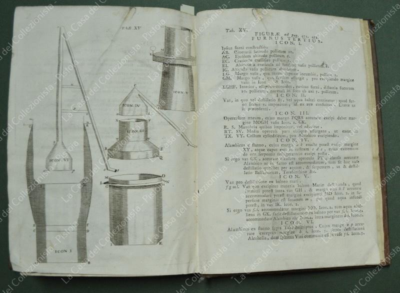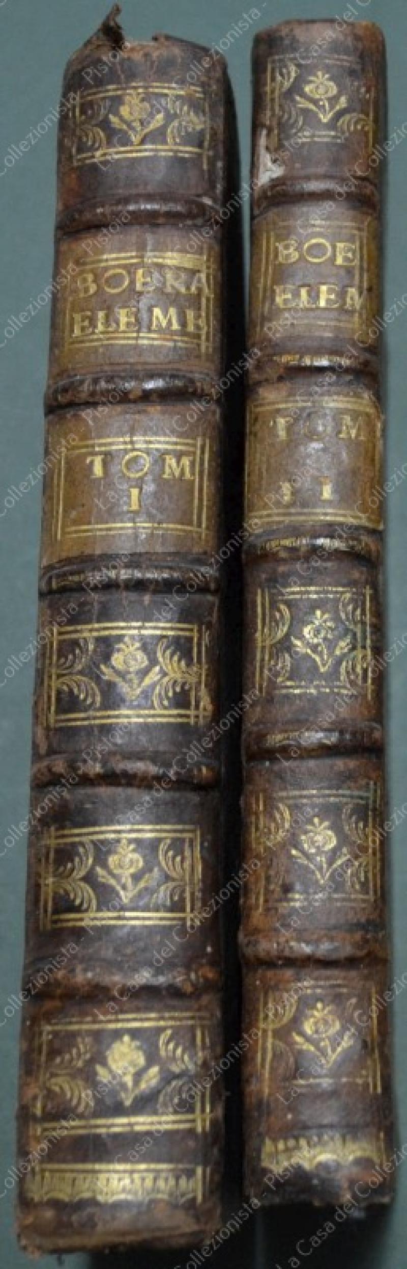 (Chimica Fig. '700). BOERHAAVE HERMAN. ELEMENTA CHEMIAE, QUAE ANNIVERSARIO LABORE DOCUIT, IN PUBLICS, PRIVATIQUE SCHOLIS.... Venezia, presso Sebastiano Coleti, 1759. Cm 16X22,5, legature coeve in piena pelle con al dorso nervi, titoli e fregi in oro. Due volumi di pagine (8) + 499 e pagine (8) + 331 con, alla fine del primo volume, 17 tavole incise in rame . L'autore (1668 - 1738) è stato un medico e chimico olandese e viene considerato come il fondatore dell'insegnamento clinico. Alcune usure alle legature, interni buoni eccetto piccoli difetti e qualche lieve segno d'umidità alle ultime tavole e pagine. (Rif.F6756)