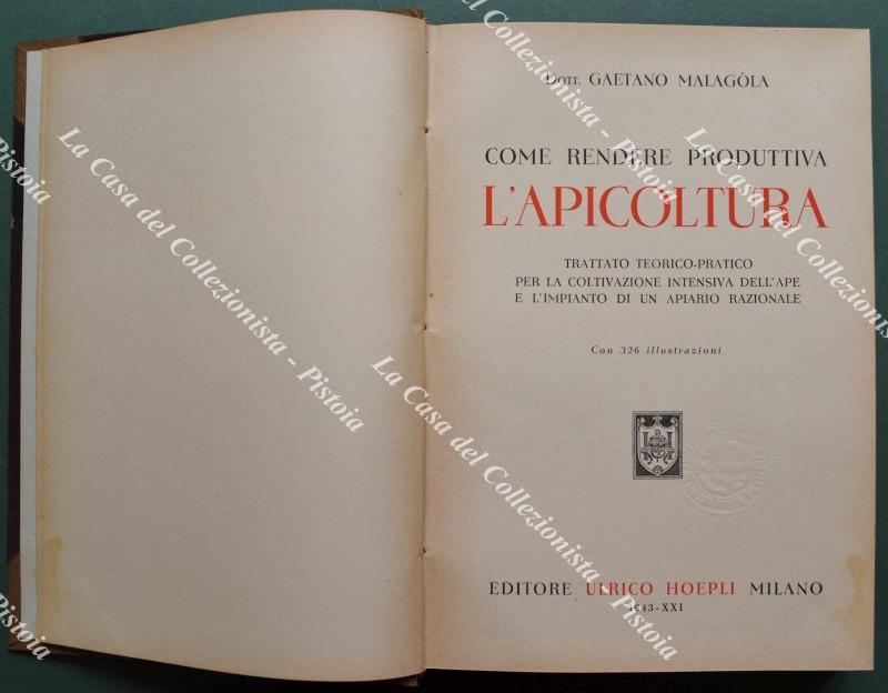 (Apicoltura) MALAGOLA GAETANO. COME RENDERE PRODUTTIVA L'APICOLTURA. Trattato teorico pratico per la coltivazione intensiva dell'ape e l'impianto di un apiario razionale. Con 326 illustrazioni. Milano, Hoepli, 1943. Cm 16.5x24, mezza tela del tempo, pp. XVI + 451. Conservazione ottima. (Rif.F7505-77)
