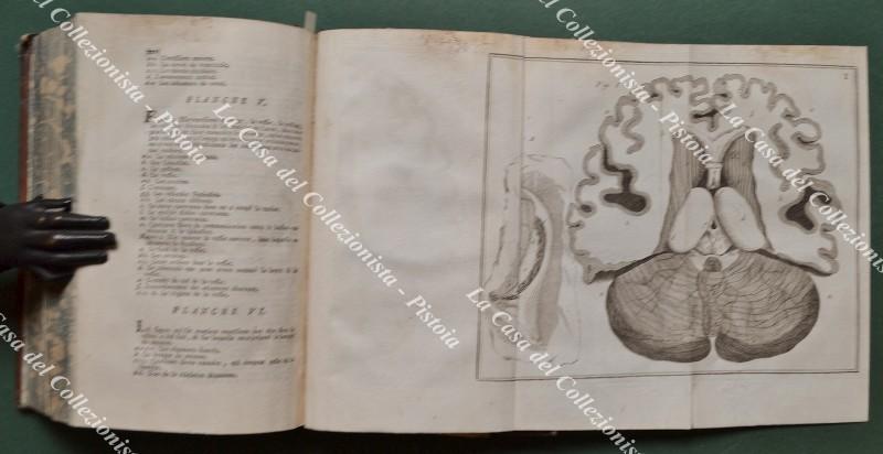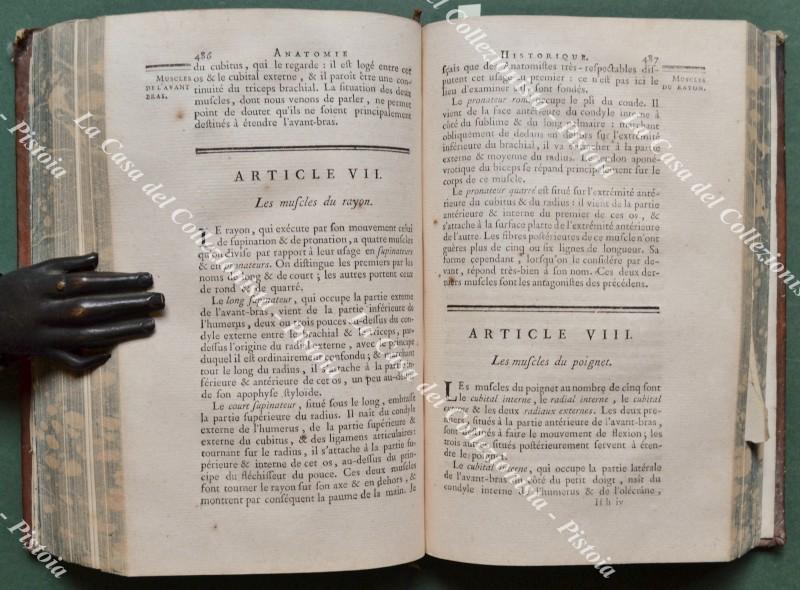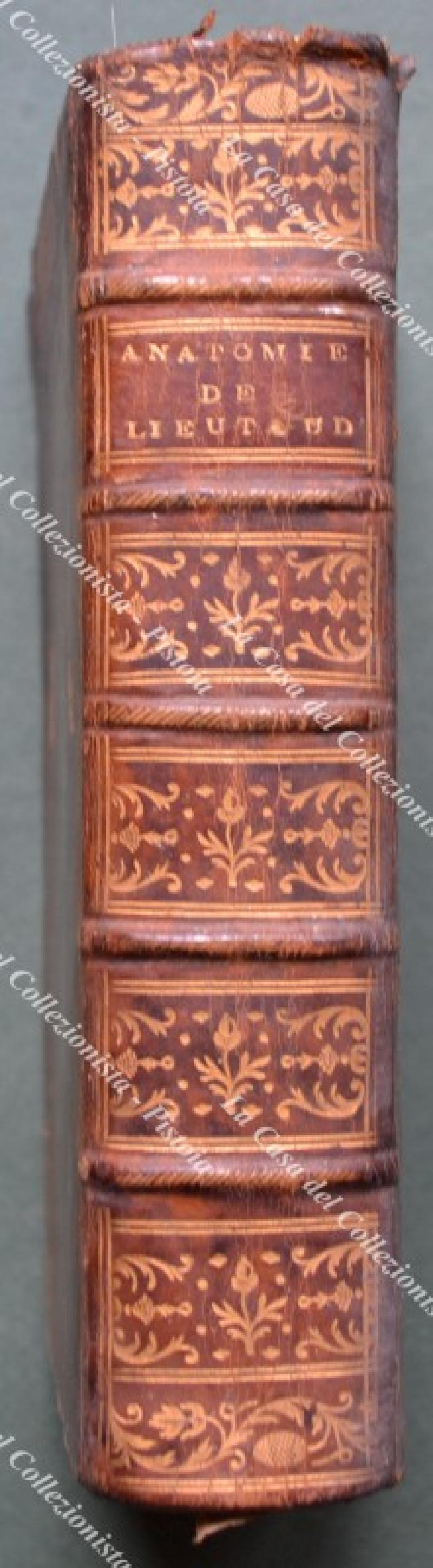 (Anatomia - figurato '700) LIEUTAUD JOSEPH. ESSAIS ANATOMIQUES, contenent L'HISTOIRE exacte de toutes les parties qui composent le Corps de l'Homme; AVEC LA MANIERE de les découvrir & les démontrer, ornés de Figures; ... Nouvelle édition, revue & augmentée. Parigi, D'Houry - Guillyn - Didot, 1766. Cm 12.5x20, legatura coeva in piena pelle con al dorso nervi e fregi in oro. Pp. (4) + XXII + (2) + 730 + XXVI con fuori testo alla fine 6 tavole incise in rame ripiegate. Opera collazionata e completa. Volume solido, difetti alle punte della legatura. Segno di muffa al margine superiore bianco delle prime cento , ultime venti pagine e al bordo superiore delle tavole. (Rif.F7659-77)