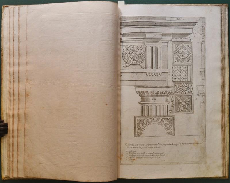 (Architettura - edizione illustrata ‘600) BAROZZI GIACOMO DA VIGNOLA. REGOLA DELLI CINQUE ORDINI DI ARCHITETTURA DI M. IACOMO BAROZZIO DA VIGNOLA. Siena, Pietro Marchetti, senza data (ma 1635). In folio (cm 26x40.6), legatura coeva in piena pergamena. 45 tavole numerate incise in rame (compresi i due frontespizi e le tavole con dedica a Volunio Bandinelli). La prima parte con tiene 37 tavole relative ai cinque ordini, alle porte e a un camino; la seconda parte, con frontespizio dal titolo “Nuova et ultima aggiunta delle porte d’architettura di Michel Angelo Buonarrotti Fiorentino Pittore Scultore et Architetto Eccell.mo”, contiene 7 tavole dedicate alle porte disegnate da Michelangelo. Legatura in buona conserva zione con piccoli restauri professionali al dorso; interno buono con solamente lievi bruniture e sporadici aloncini. (Rif.F5670-437/76)
