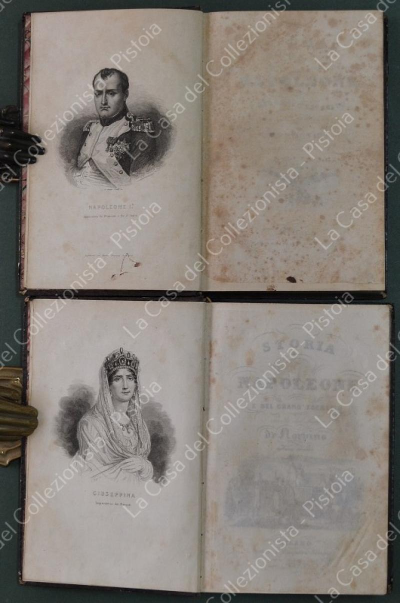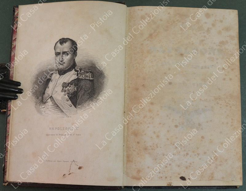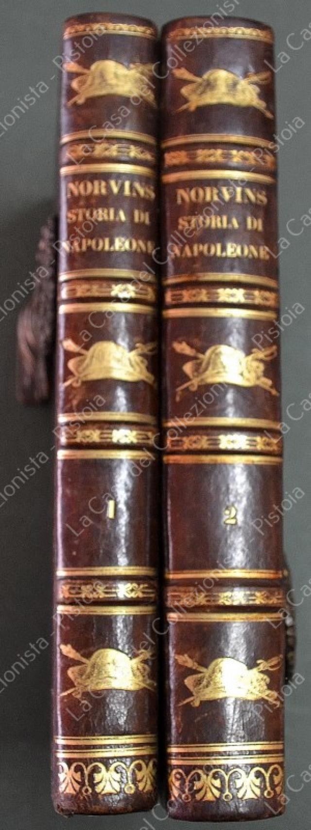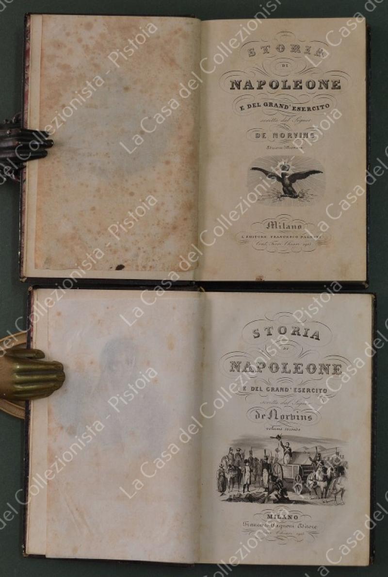 (Napoleone - illus. 1800) DE NORVINS J.. STORIA DI NAPOLEONE E DEL GRAN'ESERCITO. Milano, Pagnoni senza data (circa 1850). Cm 13,5x21, legature coeve in mezza pelle con al dorso nervi e titoli in oro. Due volumi di pagine II + 376 e pagine II + 446 + (2). Frontespizi figurati a ciascun volume, due ritratti all'antiporta e fuori testo 57 tavole incise su rame (fra cui 4 fac - simili ripiegati). Al nostro esemplare mancano all'origine la tavola 5 (Bonaparte visita gli appestati) del primo volume e la tavola 8 (morte di Lannes) del secondo volume; in più perchè doppia, la tavola del secondo volume (ritratto di M. Luigia). Volumi solidi, legature ben conservate eccetto minime usure, lievi ingiallimenti alla carta delle pagine e minime mende. (Rif.F7859)