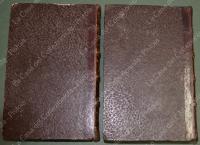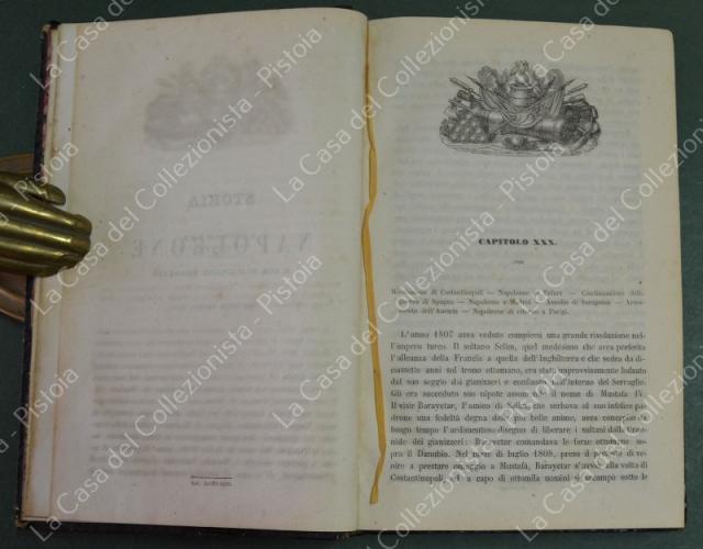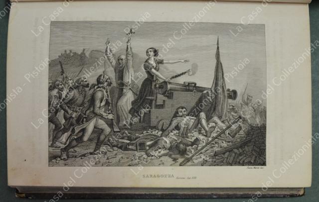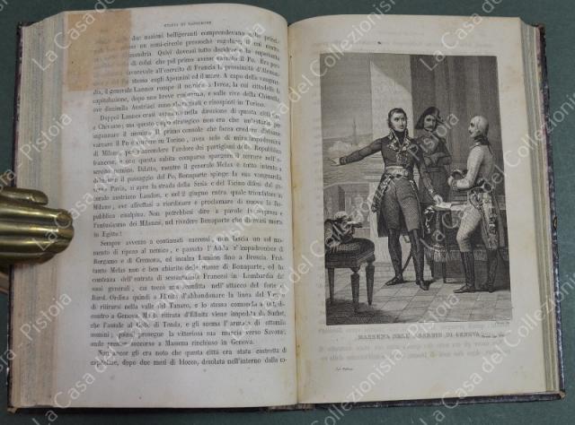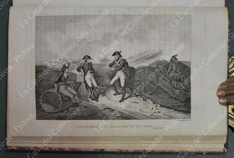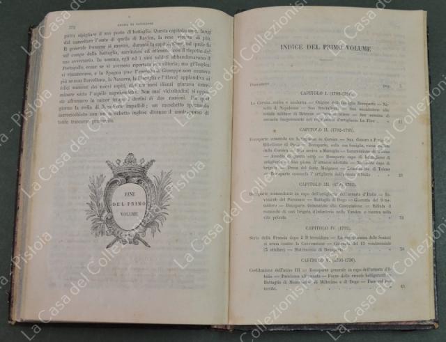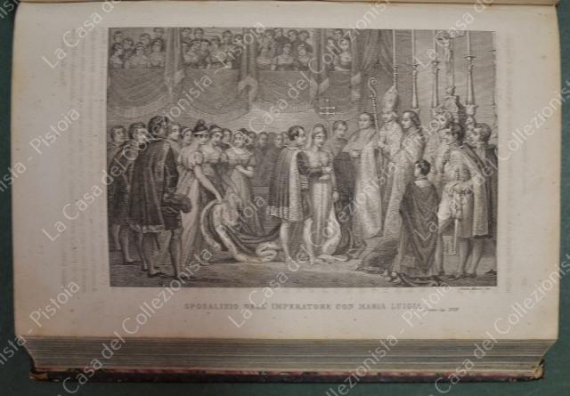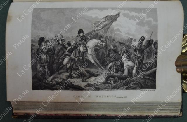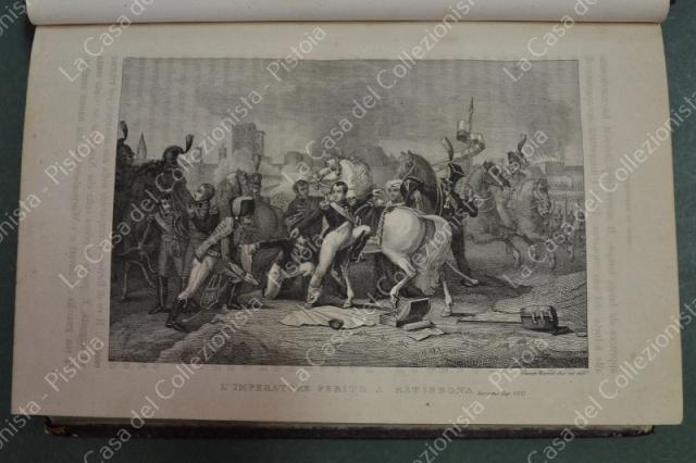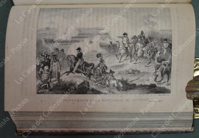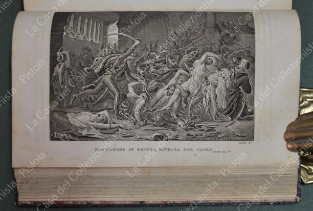 (Napoleone - illus. 1800) DE NORVINS J.. STORIA DI NAPOLEONE E DEL GRAN'ESERCITO. Milano, Pagnoni senza data (circa 1850). Cm 13,5x21, legature coeve in mezza pelle con al dorso nervi e titoli in oro. Due volumi di pagine II + 376 e pagine II + 446 + (2). Frontespizi figurati a ciascun volume, due ritratti all'antiporta e fuori testo 57 tavole incise su rame (fra cui 4 fac - simili ripiegati). Al nostro esemplare mancano all'origine la tavola 5 (Bonaparte visita gli appestati) del primo volume e la tavola 8 (morte di Lannes) del secondo volume; in più perchè doppia, la tavola del secondo volume (ritratto di M. Luigia). Volumi solidi, legature ben conservate eccetto minime usure, lievi ingiallimenti alla carta delle pagine e minime mende. (Rif.F7859)