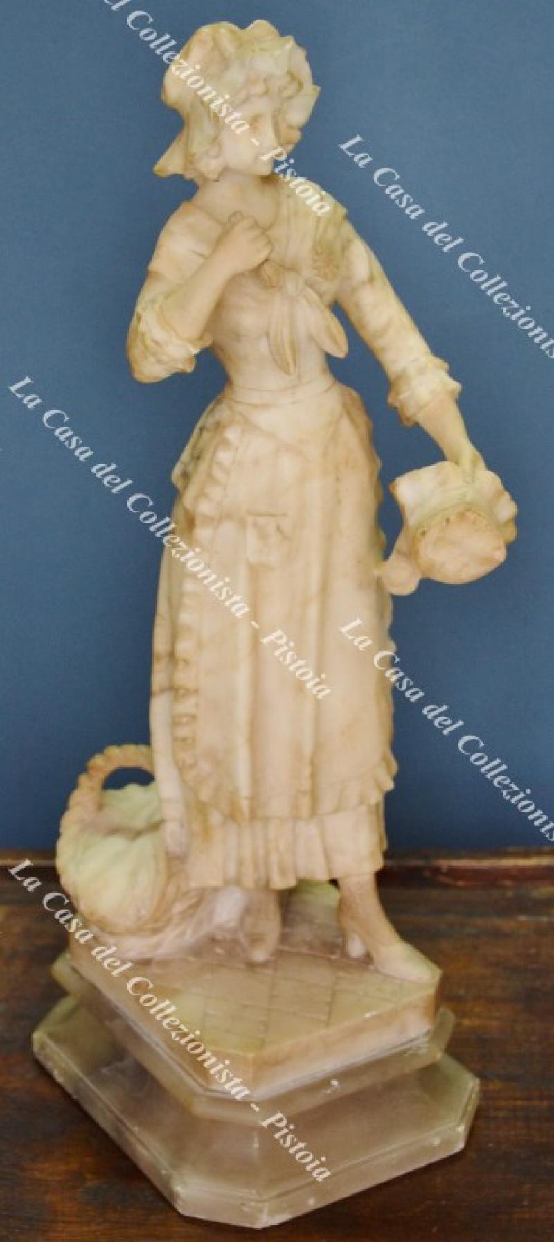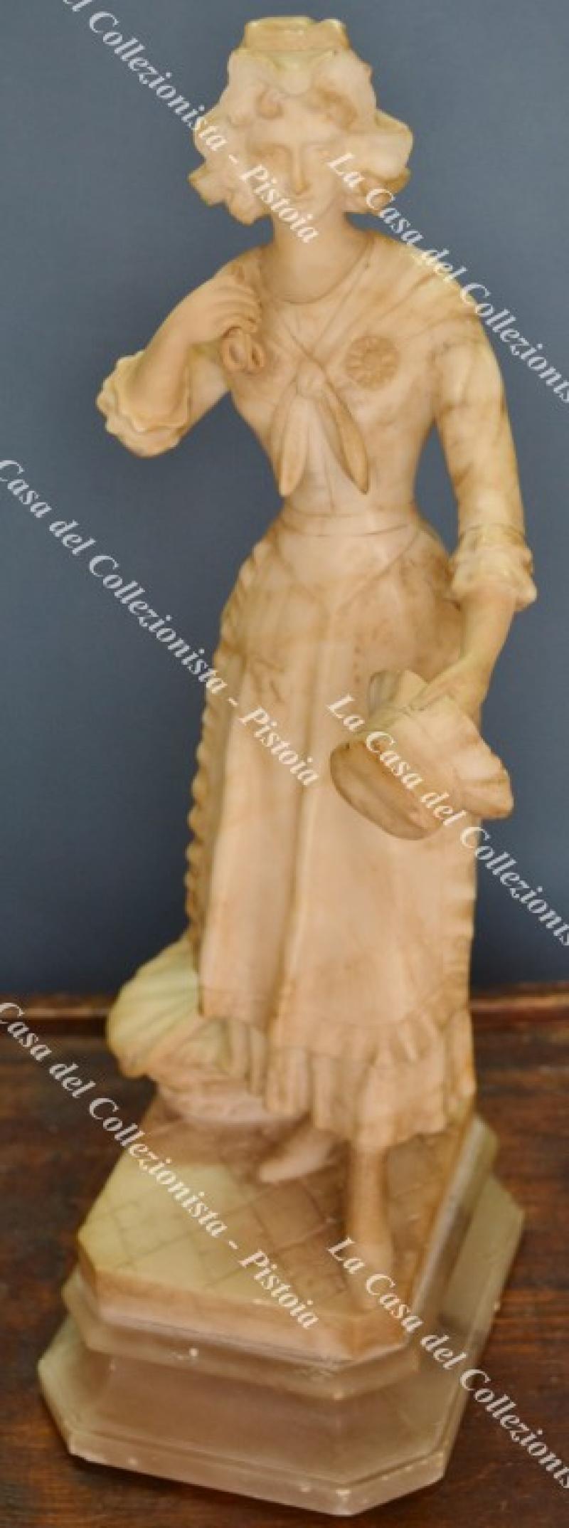 SCULTURA IN MARMO raffigurante una giovane sarta, in una mano tiene delle forbici, nell’altra un cappello, un cesto pieno di panni è poggiato a terra. Misura cm 40x11,5x15 ed è montata su base in alabastro (altezza totale cm 45). Databile alla fine dell'800. (Rif.F6417-137/76)