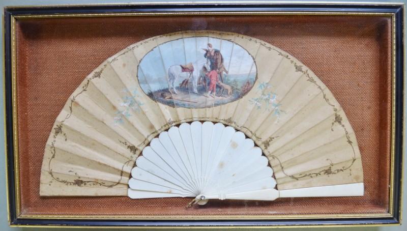 ABEL BRUN. VENTAGLIO databile alla fine dell'800. Pregevole scenetta realizzata a tempera e firmata raffigurante una scena di caccia con falcone. Stoffa, tempera e materiale di pregio. Misura cm 53x28. Conservazione buona eccetto punti di ingiallimento e lievi usure; contenuto in cornice a cassetta anni cinquanta (piccole mancanze). Oggetto di pregio. (Rif.F6706-76)