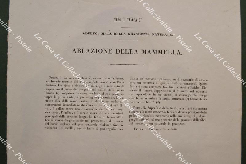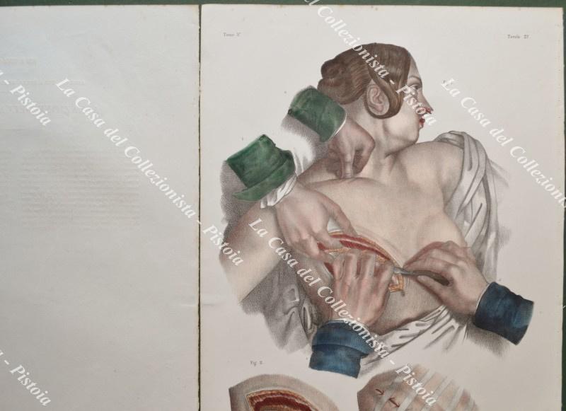 (Medicina, chirurgia) ABLAZIONE DELLA MAMMELLA.Grande tavola in litografia acquarellata all'epoca accompagnata da altra tavola descrittiva. Tratta dall'opera di Jean Baptiste Bourgery stampata in folio a Firenze tra il 1841 ed 1851.