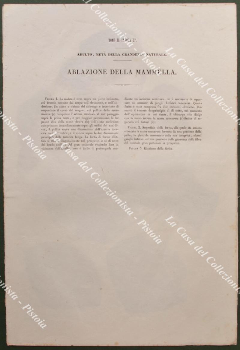 (Medicina, chirurgia) ABLAZIONE DELLA MAMMELLA. Grande tavola in litografia acquarellata all'epoca accompagnata da altra tavola descrittiva. Cm 31x44. Tratta dall'opera di Jean Baptiste Bourgery "Iconografia d'Anatomia e di Medicina Operatoria", stampata in folio a Firenze tra il 1841 ed 1851. Ottima conservazione. (Rif.F7685)