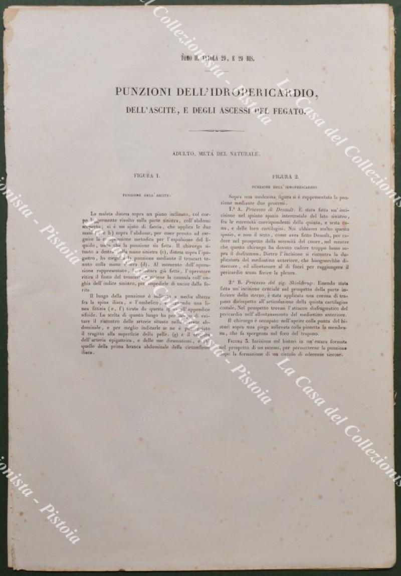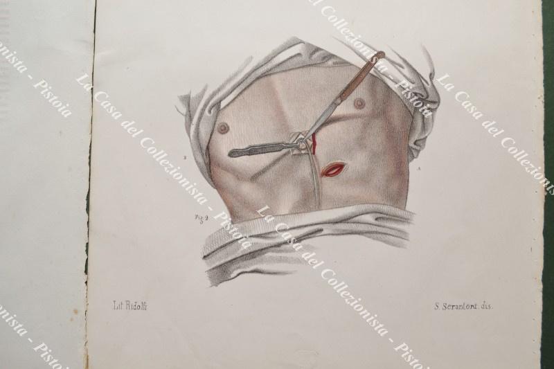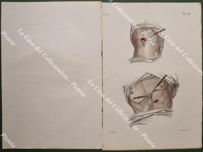 (Medicina, chirurgia) PUNZIONI DELL'IDROPERICARDIO, DELL'ASCITE E DEGLI ASCESSI DEL FEGATO. Due tavole in litografia acquarellate all'epoca accompagnate da altra tavola descrittiva. Firenze, 1841-1851.