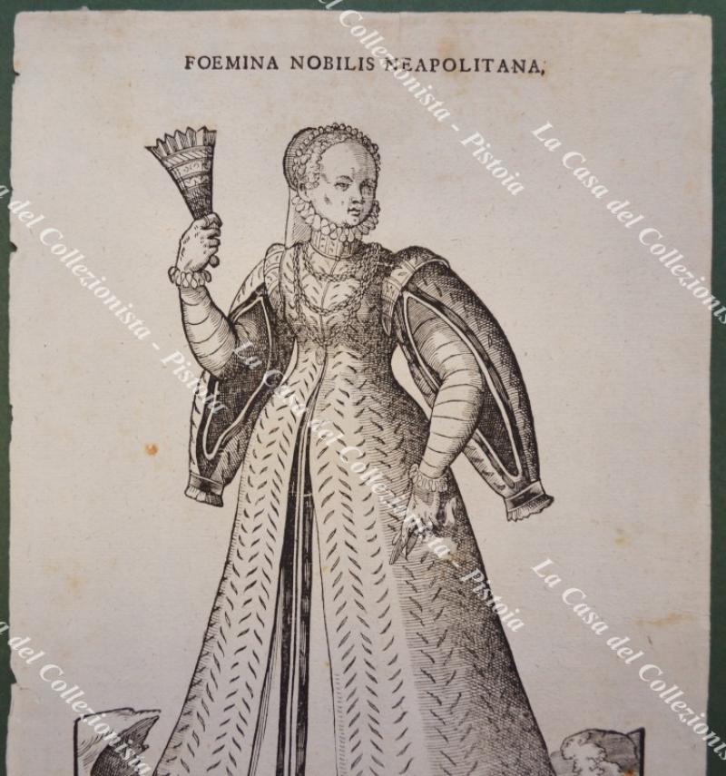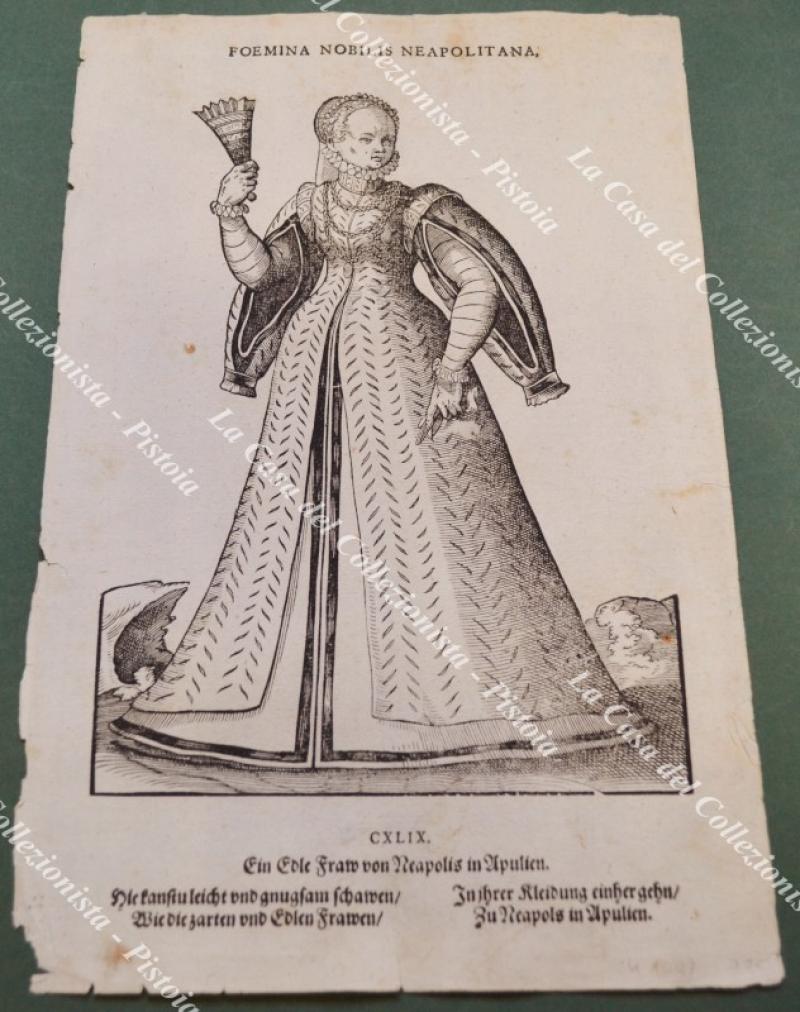 Anno 1577. FOEMINA NOBILIS NEAPOLITANA (Donna nobile di Napoli). Rara xilografia (cm 20,2x31,6) dall'opera di Hans Weigel "HABITUS PRAECIPUORUM POPULORUM TAM VIRORUM QUAM FOEMINARUM". Conservazione buona eccetto piccole imperfezioni al margine del foglio. (Rif.F7557)