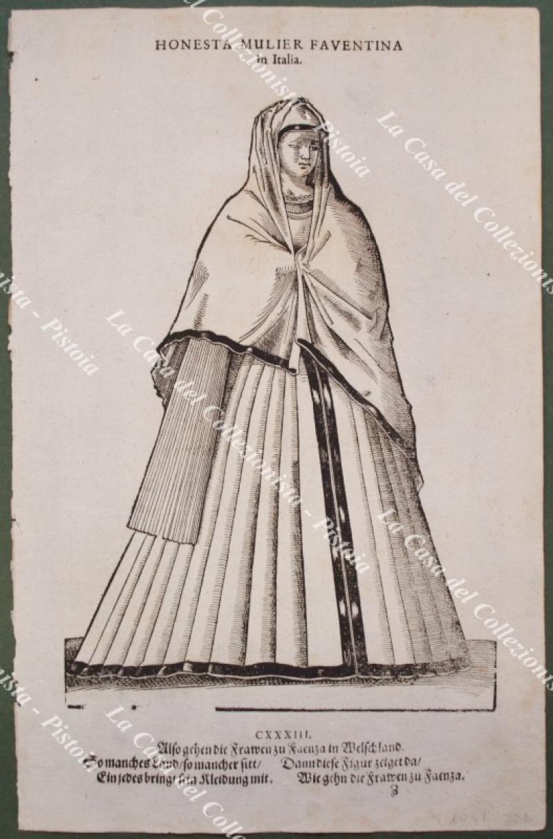 Anno 1577. HONESTA MULIER FAVENTINA in Italia (Donna di Faenza). Rara xilografia (cm 20,2x31,6) dall'opera di Hans Weigel "HABITUS PRAECIPUORUM POPULORUM TAM VIRORUM QUAM FOEMINARUM" edita a Norimberga nel 1577. Ottima conservazione. (Rif.F7559)