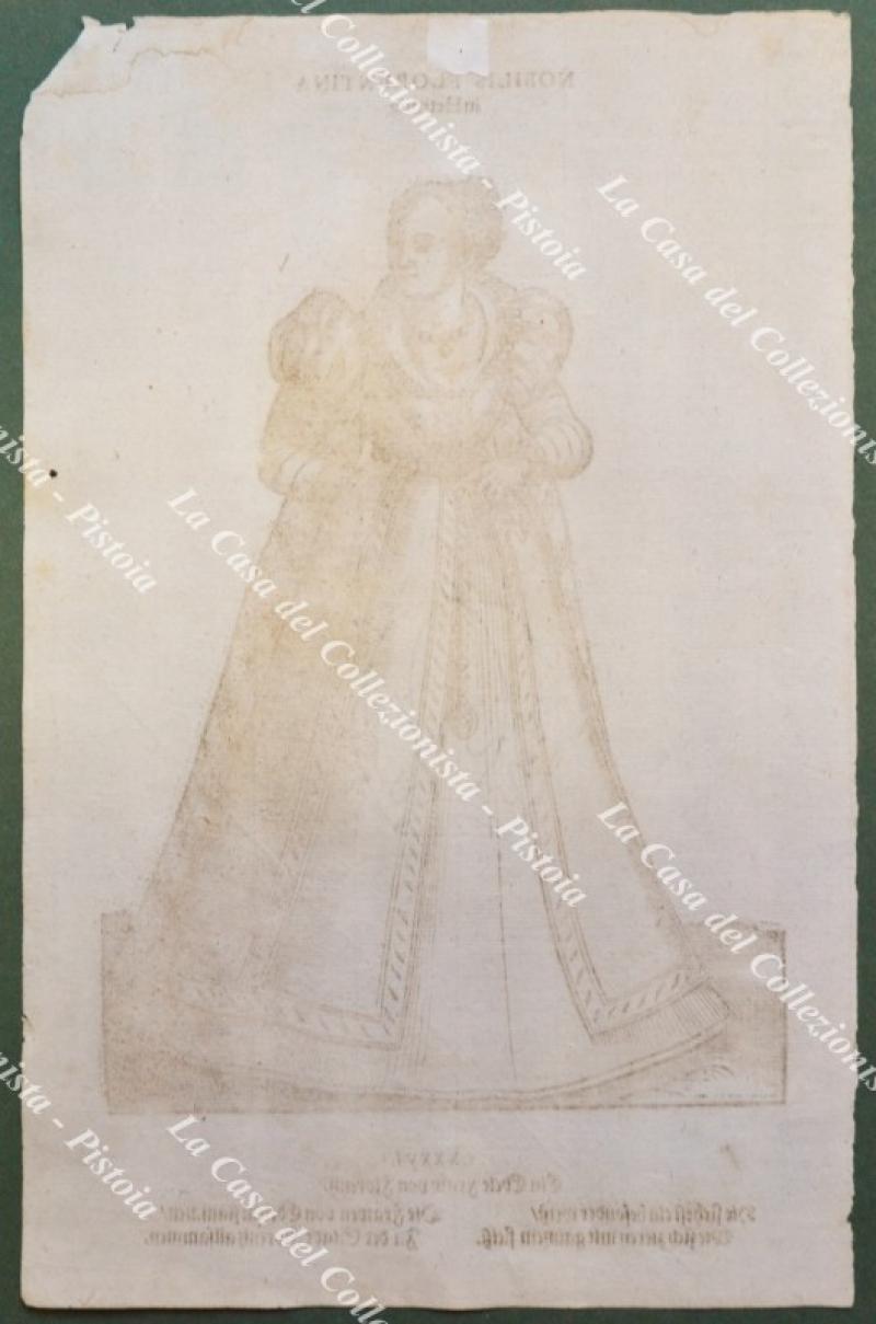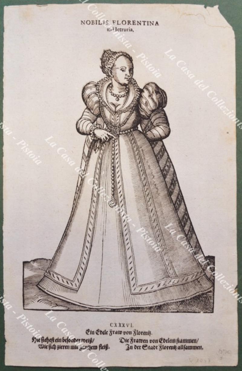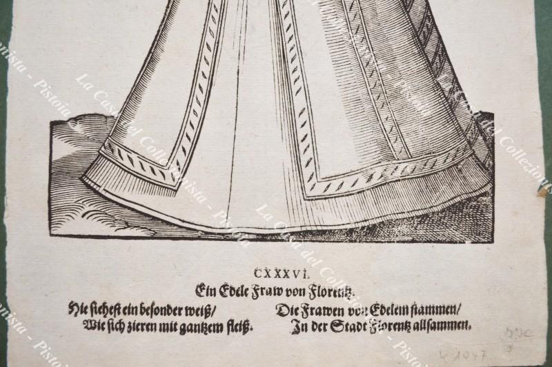 Anno 1577. NOBILIS FLORENTINA in HETRURIA (Donna nobile di Firenze). Rara xilografia (cm 20,2x31,6) dall'opera di Hans Weigel "HABITUS PRAECIPUORUM POPULORUM TAM VIRORUM QUAM FOEMINARUM" edita a Norimberga nel 1577. Conservazione buona, piccola mancanza di carta all'angolo superiore destro. (Rif.F7555)