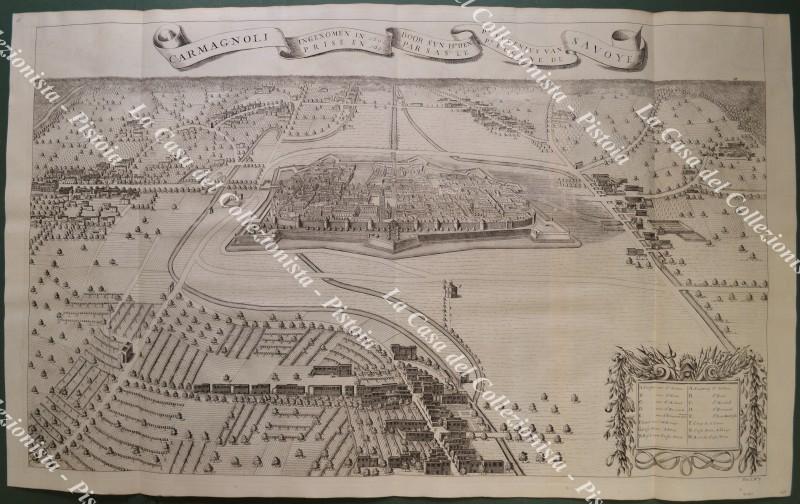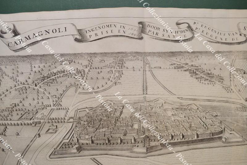 Piemonte, Carmagnola. CARMAGNOLI INGENOMEN IN 1691 DOOR SYN H.T. DEN P.R. EUGENIUS VAN SAVOIE *** CARMAGNOLI PRISE EN 1691 PAR S.A.S. EUGENE DE SAVOY". Jan Van Huchtenburg, Aia, circa 1725. Splendida grande veduta a volo d'uccello della città fortificata di Carmagnola e dei borghi vicini; misura mm 823x494 (ai margini 885x535). Perfetta conservazione. (Rif.F7485)