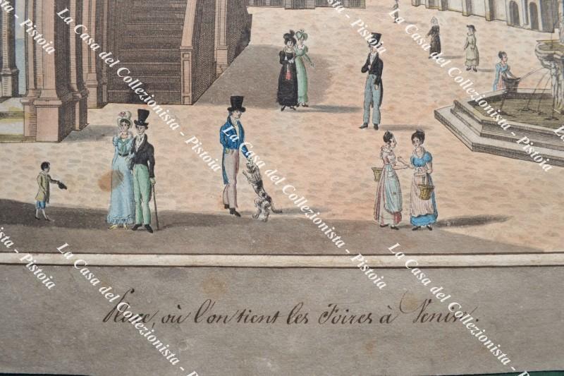 VENEZIA. PLACE, OU L'ON TIENT LES FOIRES A VENISE. Rara veduta d'ottica, databile nella seconda metà del 1700, con coloritura coeva. I personaggi sono stati aggiunti disegnandoli a mano. La parte incisa è stata all'epoca rifilata ed incollata su altro foglio con margini acquarellati e titolo manoscritto alla base. Misura cm 38x24,5 più margini (complessivamente cm 43,5x32). Piccole lacune di colore sui margini dovute a modeste abrasioni, ottimo aspetto. (Rif.F7419-77)