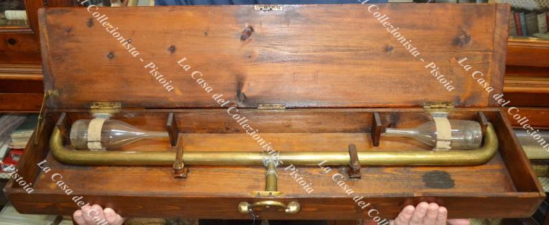 ANTICA LIVELLA AD ACQUA databile alla metà dell’800 realizzata in ottone, bicchieri in vetro soffiato integri. Contenuta nella scatola coeva in legno (cm 85x19x7,5). (Rif.F6402-151/76)