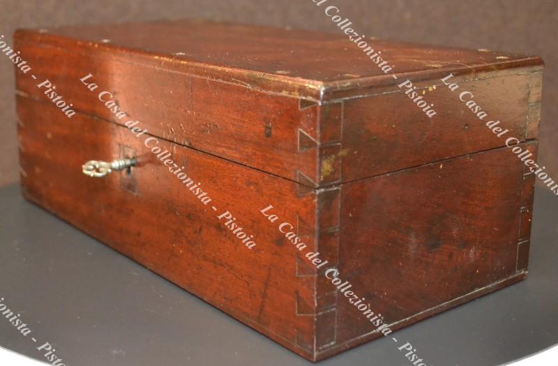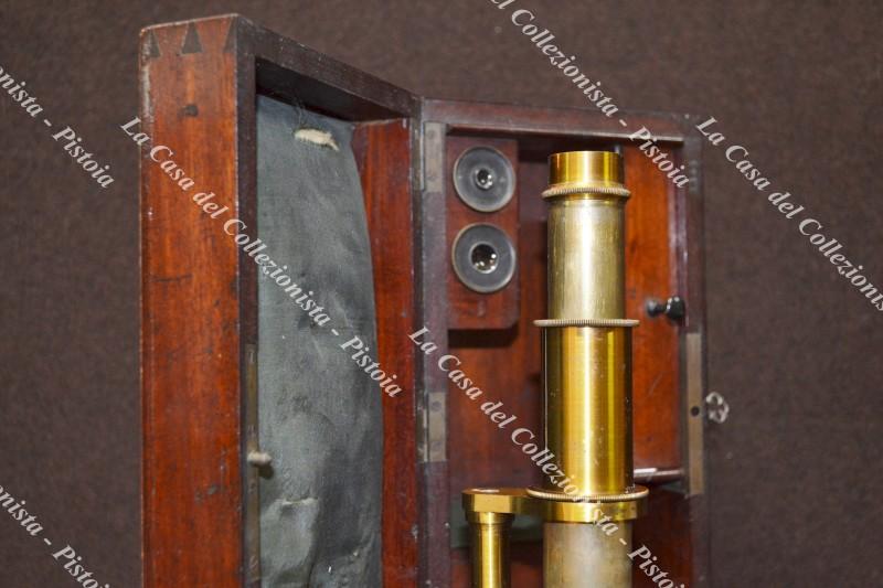 MICROSCOPIO ANTICO in ottone, non siglato, circa 1890. Alloggiato dentro la custodia originale in legno con due scomparti per l’alloggio degli oculari (presenti) ed un cassettino di servizio. Monta un obbiettivo, la messa a fuoco è manuale. (Rif.F6400-157/76)