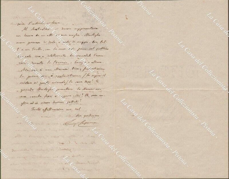 CAPUANA LUIGI (Mineo 1839 – Catania 1915). Famoso scrittore fra i massimi esponenti del Verismo. Lettera del 9 giugno 1910 da Catania indirizzata a Roma a Giustino Ferri direttore di “L’Alfiere”. Bifolio di cm 13,4x21 (unita la busta). Su due facciate 32 righe autografe e firma “Luigi Capuana”. Interessante contenuto a carattere letterario: ringrazia l’amico per l’ottima recensione dedicata al suo dramma “Un Brindisi”, prosegue scrivendo di Salvatore Di Giacomo e di altri argomenti teatrali. Ottima conservazione. (Rif.D9362)