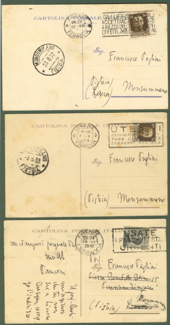 PANCRAZI PIETRO (Cortona, Arezzo 1893 - Firenze 1952). Scrittore italiano. Fu redattore delle riviste Pegaso e Pan. Curò con Papini l'antologia 'Poeti d'oggi', fu autore di saggi critici (Ragguagli di Parnaso, Scrittori italiani dal Carducci al D'Annunzio, Il giardino di Candido) e di racconti. Insieme di tre cartoline postali, con intestazioni della rivista Pegaso, indirizzate al professor Francesco Pagliai di Monsummano e spedite una da Venezia (1929) e due da Firenze (1932). Ciascuna con varie righe autografe e firma. Buona conservazione. (Rif.A7469-72/46-autografi)