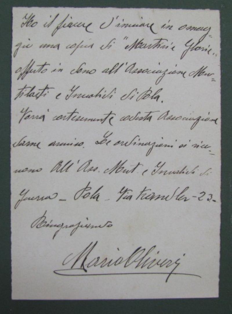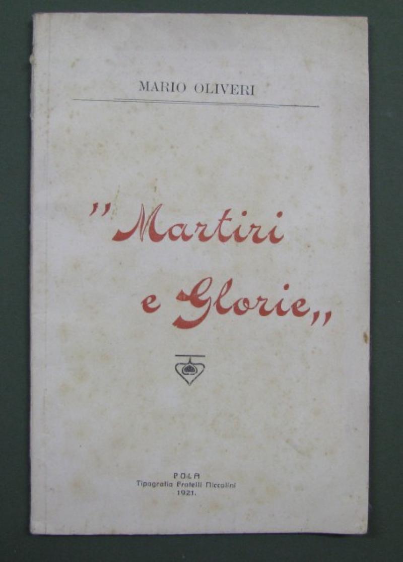 (Poesia - patriottismo - autografo) OLIVERI MARIO. Martiri e Glorie Pola, Tip. Niccolini, 1921. Dedica autografa dell'Autore e 1 sua lettera di alcune righe autografe e firma
