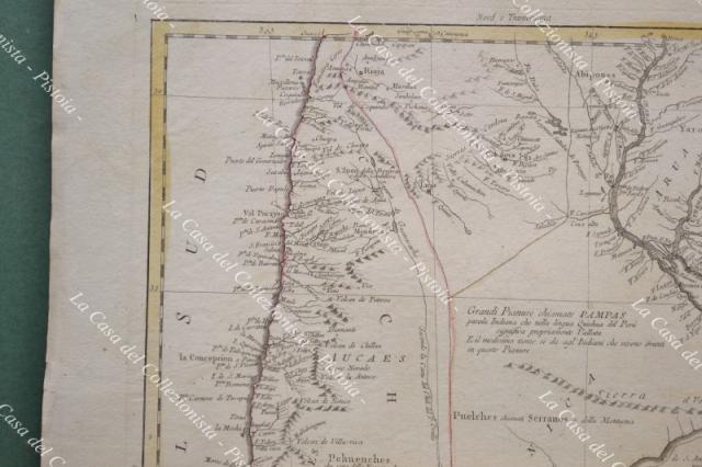 AMERICA MERIDIONALE. Carta geografica originale. "CHILI LA TERRA MAGELLANICA COLL' ISOLA DELLA TERRA DEL FUOCO". Venezia, Antonio Zatta 1785. Mm 310x415 (ai margini 480x375). Buona conservazione, minimi ingiallimenti. (Rif.D9351)