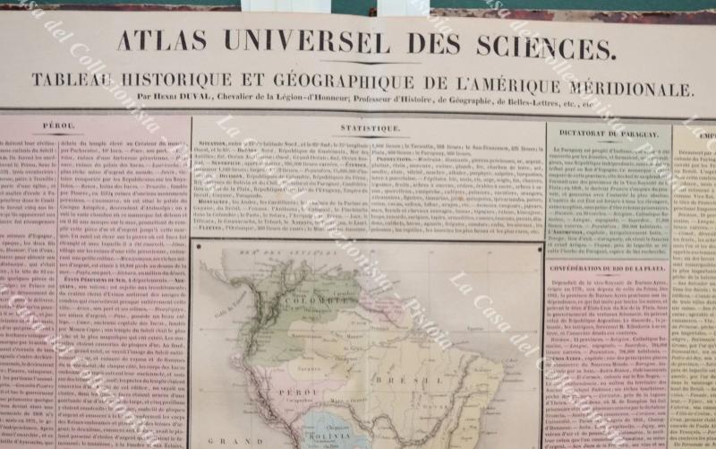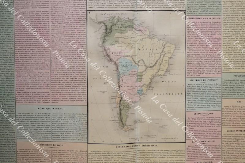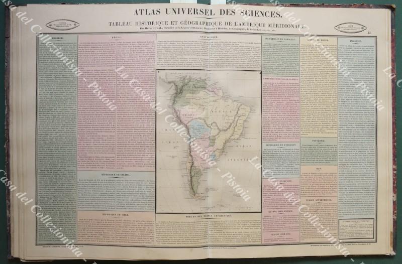 America meridionale. TABLEAU HISTORIQUE ET GEOGRAPHIQUE DE L'AMERIQUE MERIDIONALE. Grande carta acquarellata all'epoca di cm 58x40,5 ai margini. Tratta da ATLAS UNIVERSEL DES SCIENCES PAR HENRI DUVAL stampato nel 1839 a Parigi dalla tipografia Terzuolo. Buona conservazione. (Rif.F4045)