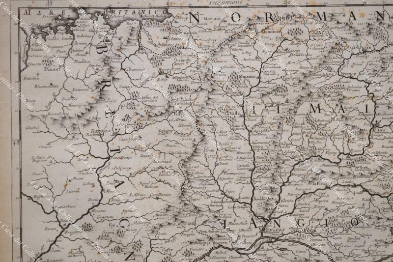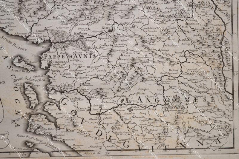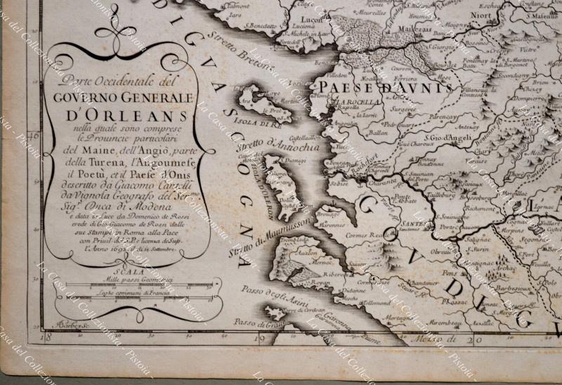 Anno 1692. Francia France. PARTE OCCIDENTALE DEL GOVERNO GENERALE D'ORLEANS nella quale sono comprese le provincie particolari del Maine, dell'Angiò, parte della Turena, l'Angoumese, il Poetù, et il Paese d'Onis descritto da Giacomo Cantelli da Vignola....". Grande carta geografica stampata a Roma, da Domenico De Rossi, nel 1692. Incisione su rame di cm 43,3x57 (ai margini cm 57,7x60,4). Leggera brunitura centrale e punti di ossidazione per lo più a retro. (Rif.D6305)