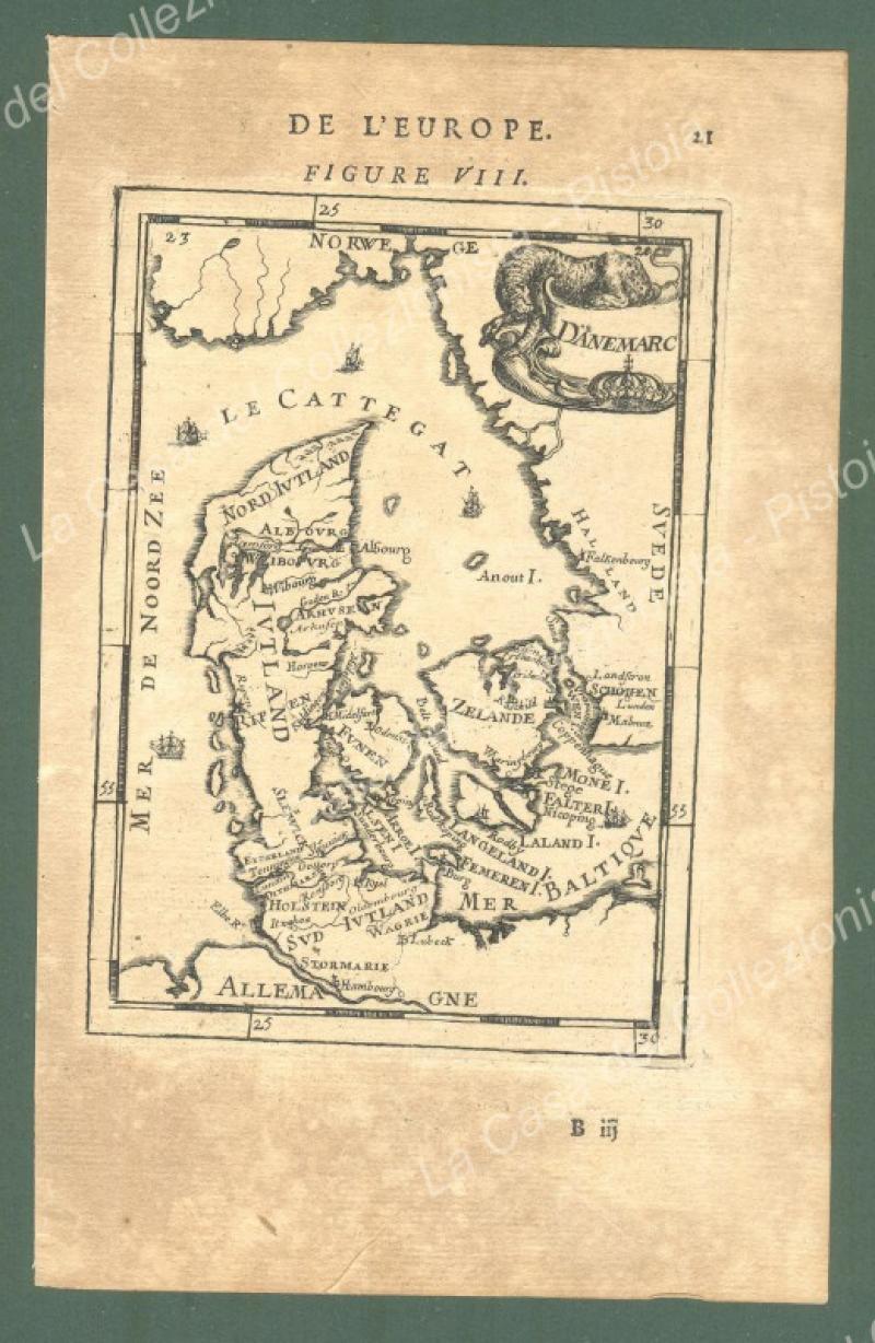 DANIMARCA, DANEMARC. Cartina geografica, realizzata con la tecnica dell'acquaforte, tratta da 'Description de l'Univers' opera di A.M. Mallet stampata a Parigi, presso Denys Thierry, nell'anno 1683. Misura cm 14,4x10,2 (ai margini cm 13,5x21,4). Carta brunita. (Rif.E4164)