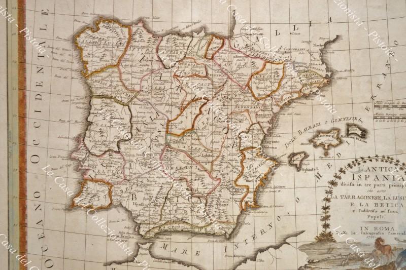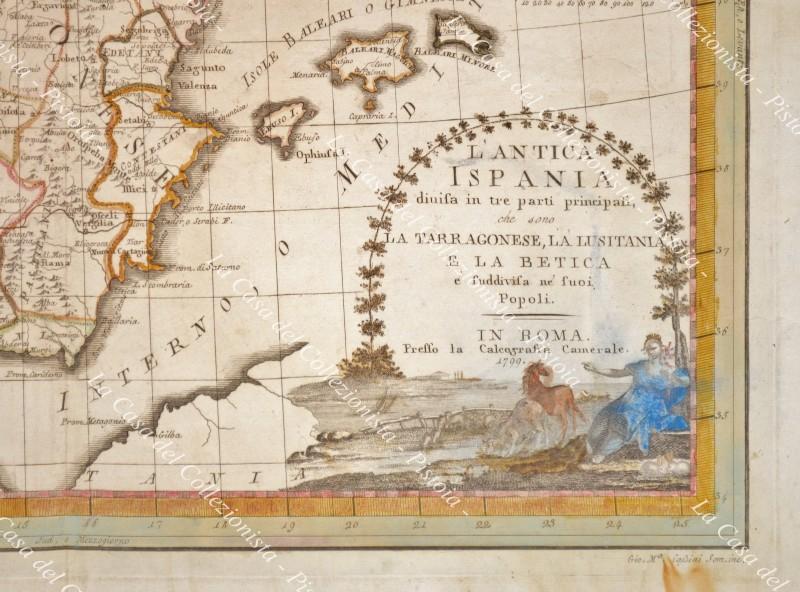 Espana Spagna, anno 1799. L'ANTICA ISPANIA divisa in tre parti principali, che sono LA TARRAGONESE, LA LUSITANIA E LA BETICA e suddivisa ne' suoi Popoli. Cassini Giovanni Maria (1745 - 1824). In Roma, Presso la Calcografia Camerale, 1799. Cartiglio figurato, coloritura coeva, mm 492x355 più ampi margini bianchi. Buona conservazione eccetto lieve sbavatura di colore sul cartiglio ed una brunitura sul margine inferiore. (Rif.D9712)