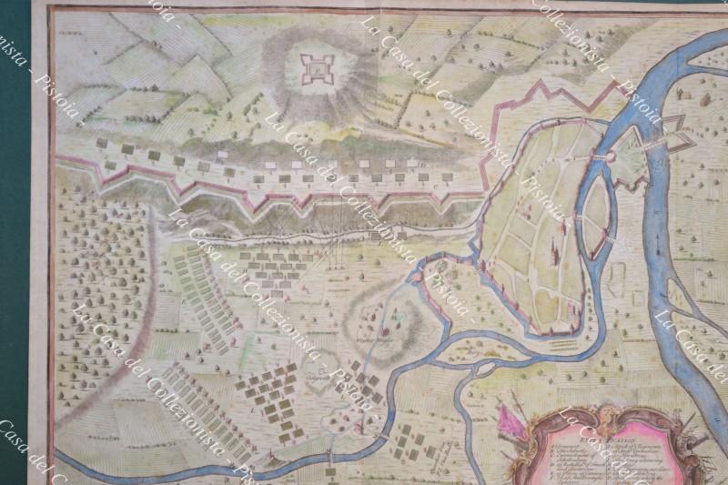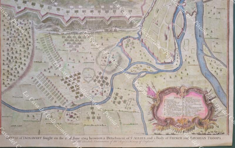 GERMANIA. DEUTCHLAND. Battle of Donawertfought on the 2d. of June 1704 between a Detachment of ye allies and a body of French and Bavarian Troops. Incisione all'acquaforte di mm 460x360 più margini, colorata all'epoca. Tratta dall'opera di Nicolas Tindal, anno 1745. Buona conservazione. (Rif.D8301)