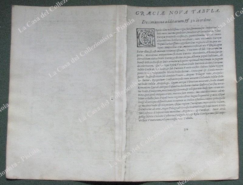 GRECIA. “GRAETIA NUOVA TAVOLA”. Mostra l’intera Grecia, l’Egeo, la parte occidentale della Turchia, l’Albania ed il mare Ionio. Carta geografica del mondo moderno di Ruscelli, tratta dall’opera “GEOGRAPHIA CL. TOLEMAEI ALEXANDRINI” stampata a Venezia da Vincenzo Valgrisi nel 1562. Carta di mm 285x220 ai margini. Nitida impressione, ottima conservazione. (Rif.D6783 - 200/70)