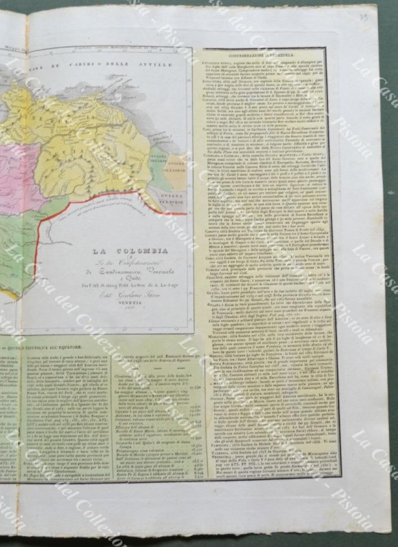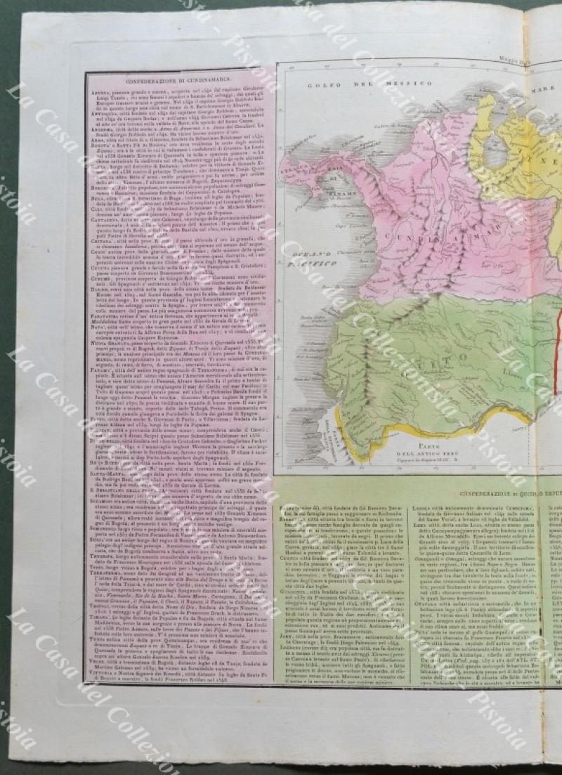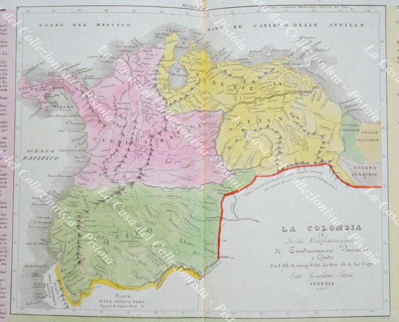 LA COLOMBIA. Le tre Confederazioni di Cundinamarca, Venezuela e Quito. Da Atlante Le Sage, Venezia, circa 1835. Cm 55x40, colorata all'epoca. Minime imperfezioni lungo la piega editoriale. (Rif.F1203)