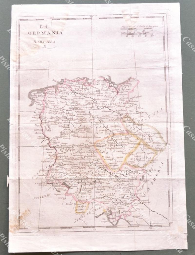 LA GERMANIA. Carta geografica dai confini delineati all'acquerello di cm 26x37 ai margini. Più volte ripiegata (tratta da libro), edita a Roma nel 1804. Lieve alone. (Rif.F1215)