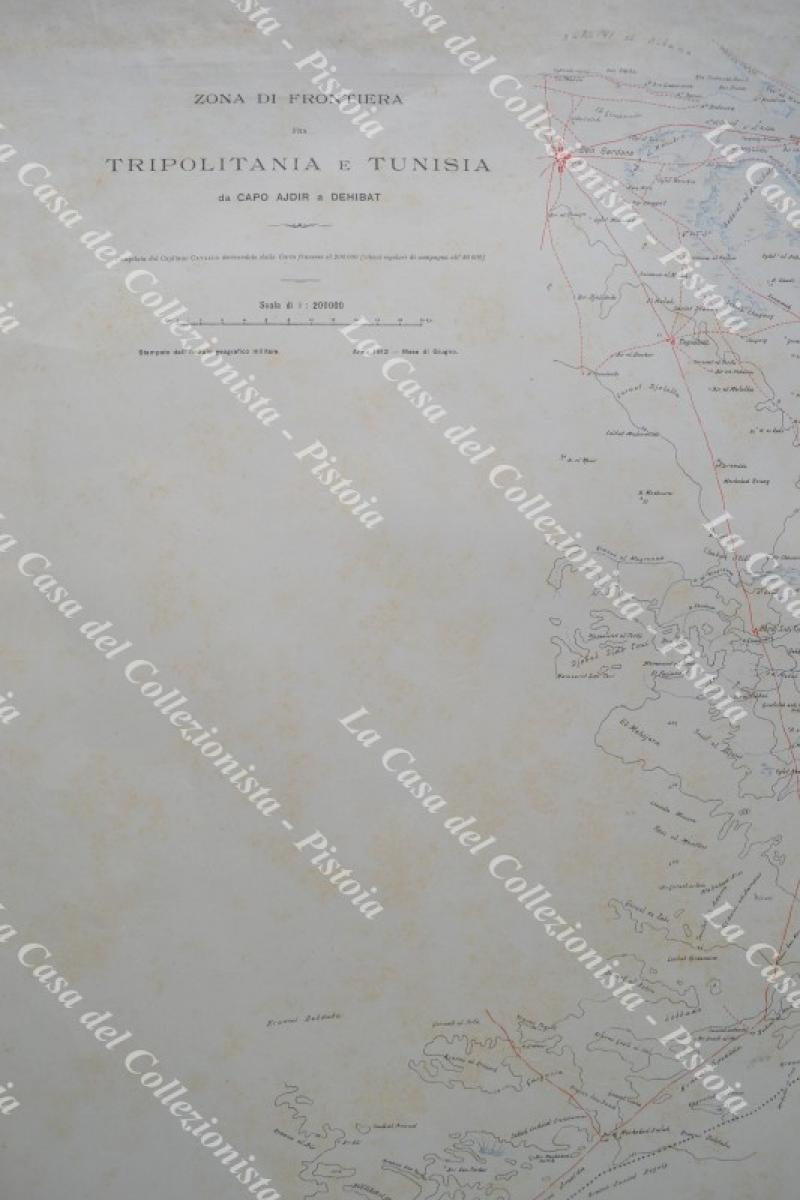 LIBIA. "ZONA DI FRONTIERA FRA TRIPOLITANIA E TUNISIA. Da capo Ajdia a Dehibat". Grande carta (cm 63x88) stampata nel 1912 dall'Istituto Geografico Militare. Scala 1 a 200.000. Ingiallimenti e qualche difetto sul margine destro. (Rif.F2213)